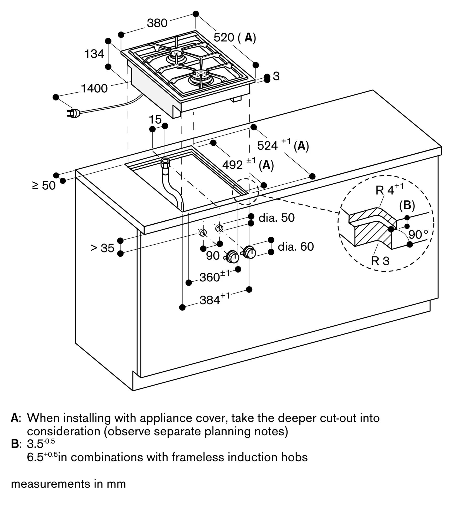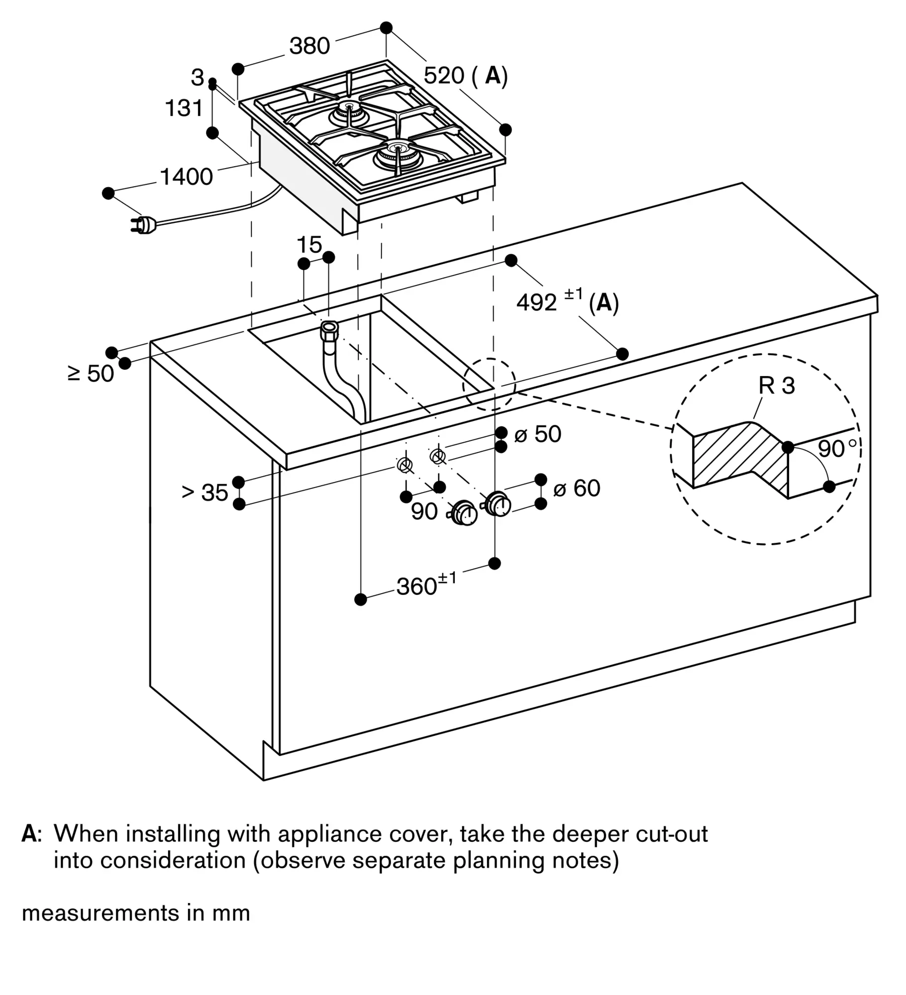 Installation is possible in worktops made of stone, synthetics or solid wood. Heat resistance and watertight sealing of the cut edges must be observed. Concerning other materials please consult the worktop manufacturer.