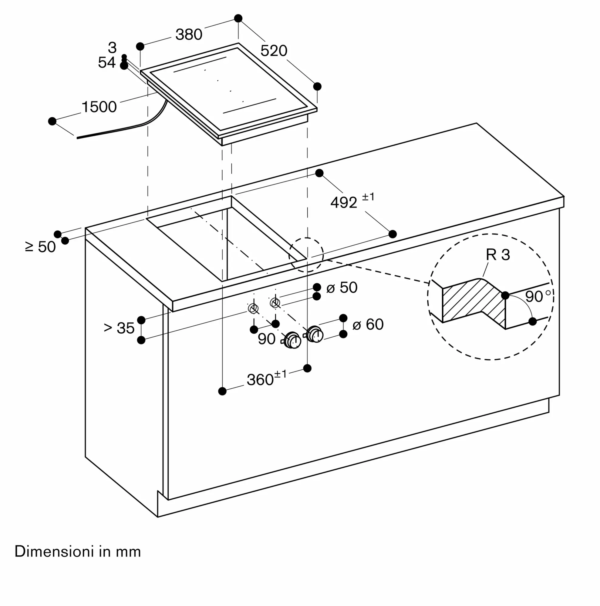 L'installazione è possibile in piani di pietra, sintetici o in legno massello. Devono essere rispettate la resistenza termica e la tenuta stagna dei bordi dell' intaglio. Per quanto riguarda gli altri materiali si prega di consultare il produttore del piano di lavoro.