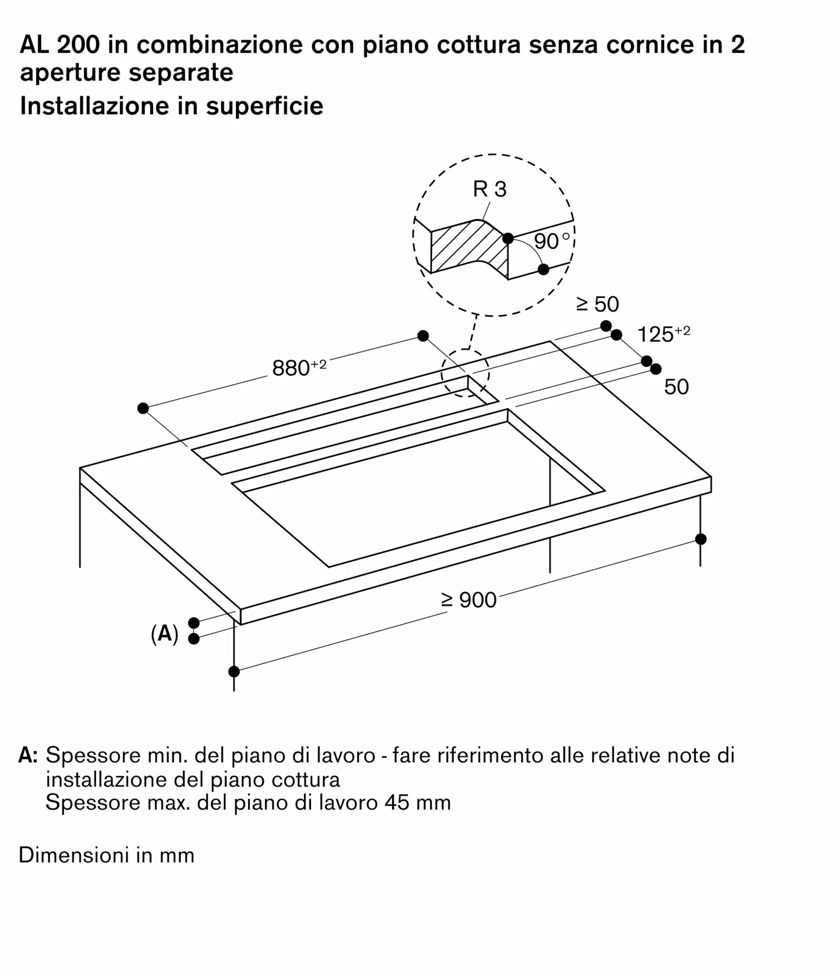 L'installazione è possibile in piani di pietra, sintetici o in legno massello. Devono essere rispettate la resistenza termica e la tenuta stagna dei bordi dell' intaglio. Per quanto riguarda gli altri materiali si prega di consultare il produttore del piano di lavoro.