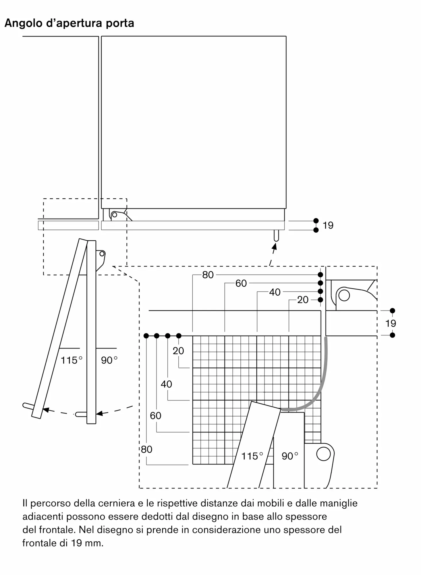 Angolo di apertura della porta di 115°, possibilità di bloccaggio a 90 °.