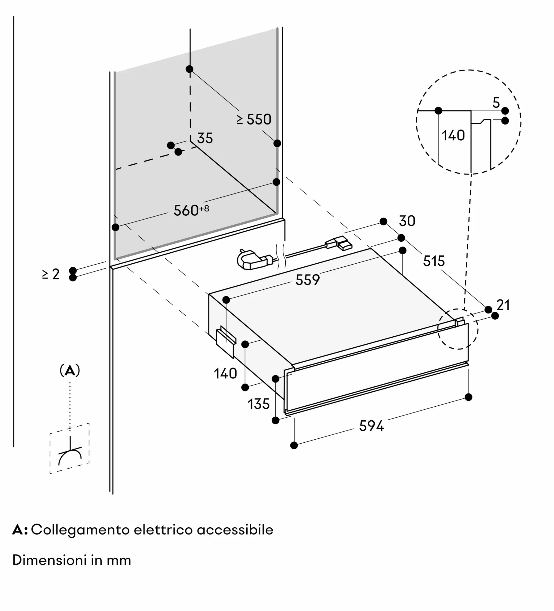 Se il cassetto viene installato sopra una lavastoviglie, è necessaria una nicchia incasso dedicata.
