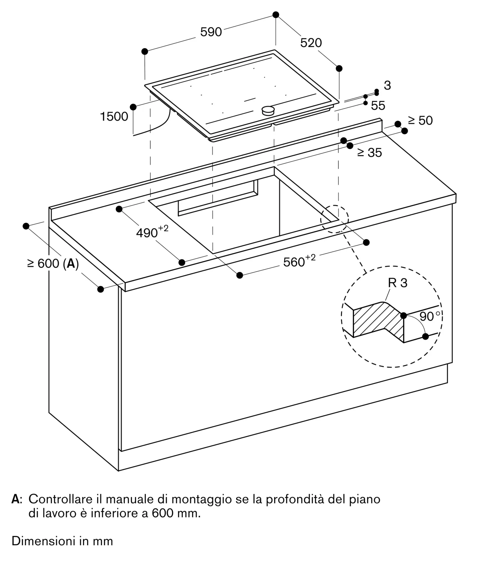 L'installazione è possibile in piani di pietra, sintetici o in legno massello. Devono essere rispettate la resistenza termica e la tenuta stagna dei bordi dell' intaglio. Per quanto riguarda gli altri materiali si prega di consultare il produttore del piano di lavoro.
