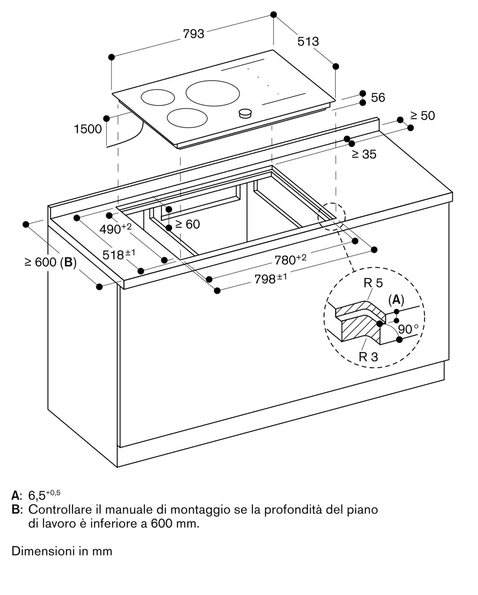 L'installazione è possibile in piani di pietra, sintetici o in legno massello. Devono essere rispettate la resistenza termica e la tenuta stagna dei bordi dell' intaglio. Per quanto riguarda gli altri materiali si prega di consultare il produttore del piano di lavoro.