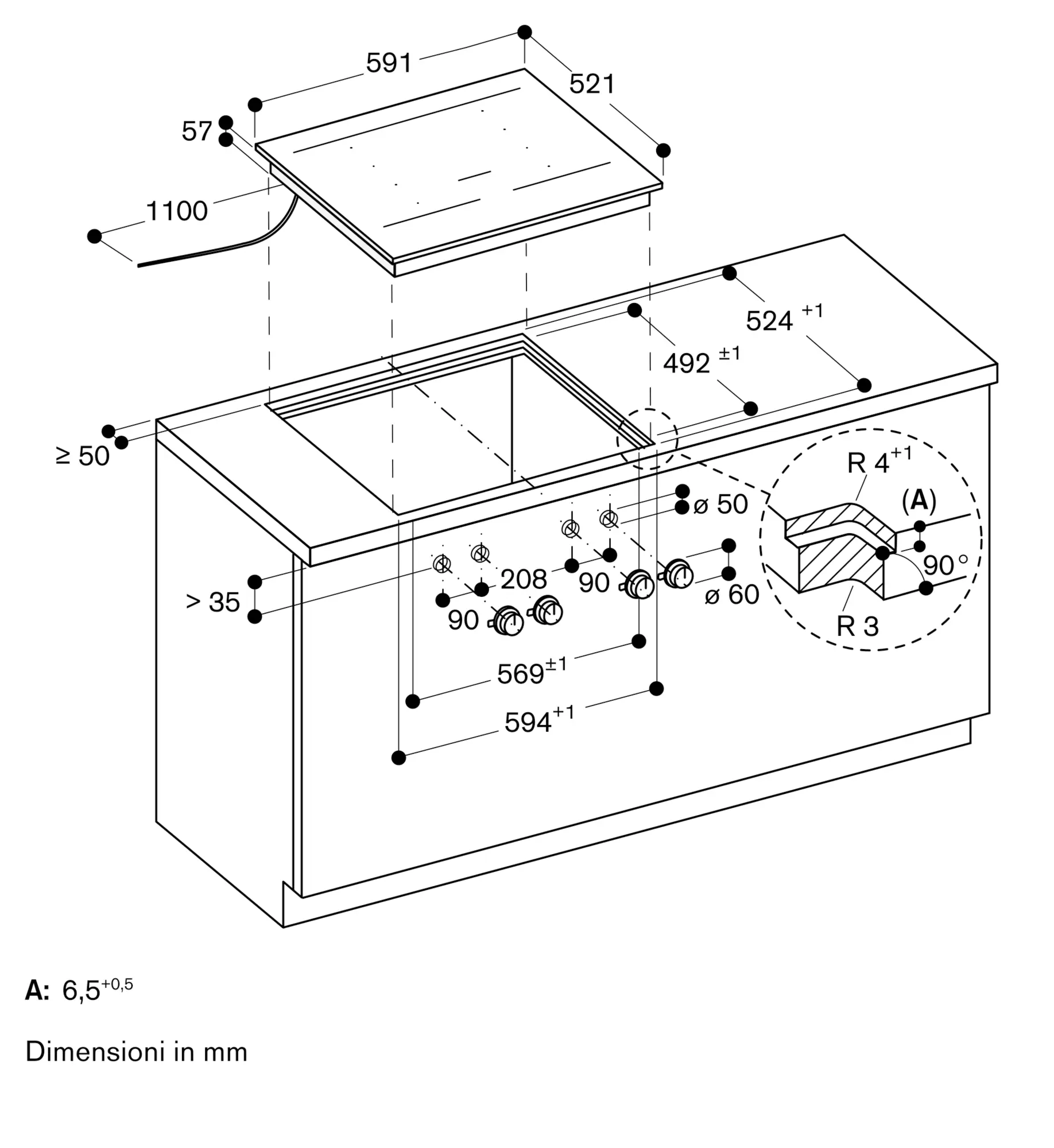 L'installazione è possibile in piani di pietra, sintetici o in legno massello. Devono essere rispettate la resistenza termica e la tenuta stagna dei bordi dell' intaglio. Per quanto riguarda gli altri materiali si prega di consultare il produttore del piano di lavoro.