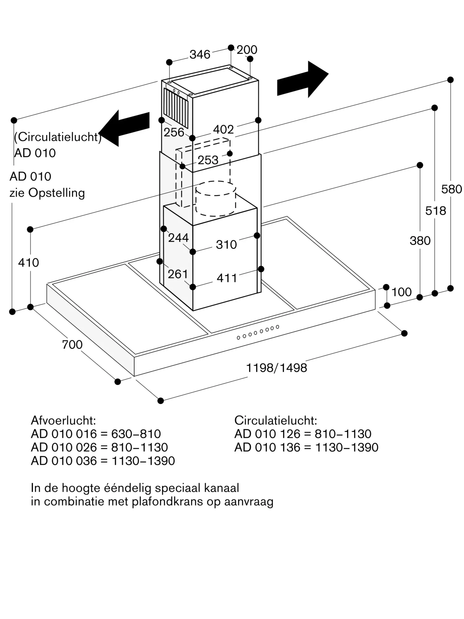Minimum afstand boven gaskookplaat: 70 cm