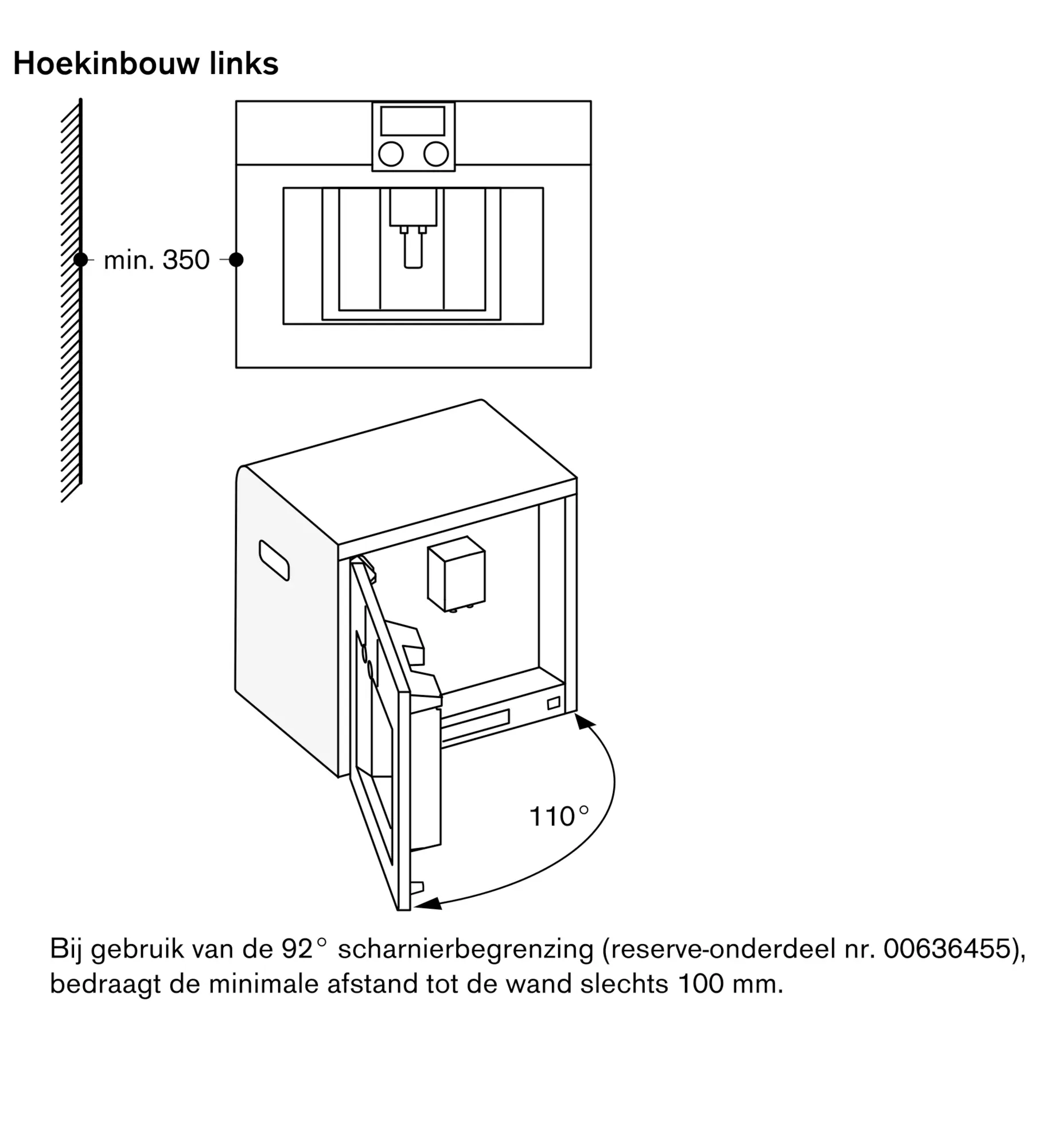 Linksdraaiende deur 92° graden te openen - afstand tot de muur dient minimaal 100 mm te bedragen (service onderdeel nr. 00636455).