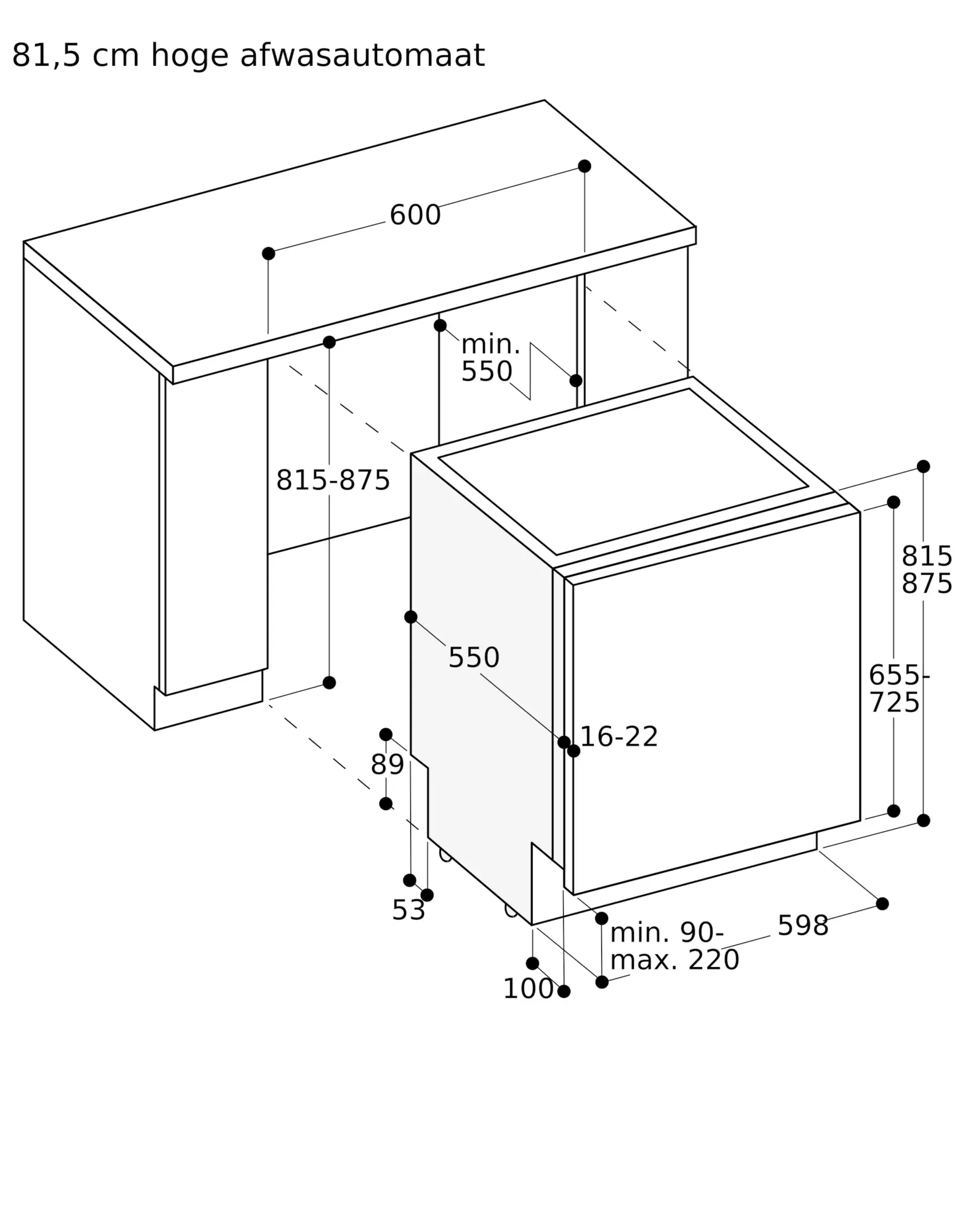 Om de projectie resterende tijd te kunnen tonen moet tenminste een sokkelterugsprong aanwezig zijn van 40 mm + dikte van het meubelfront.
