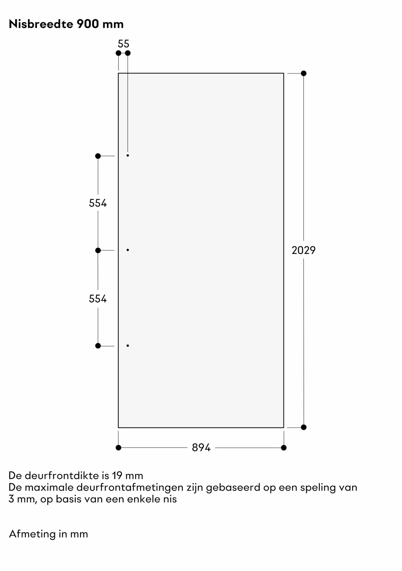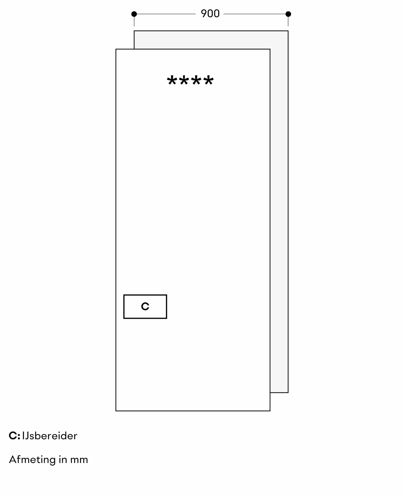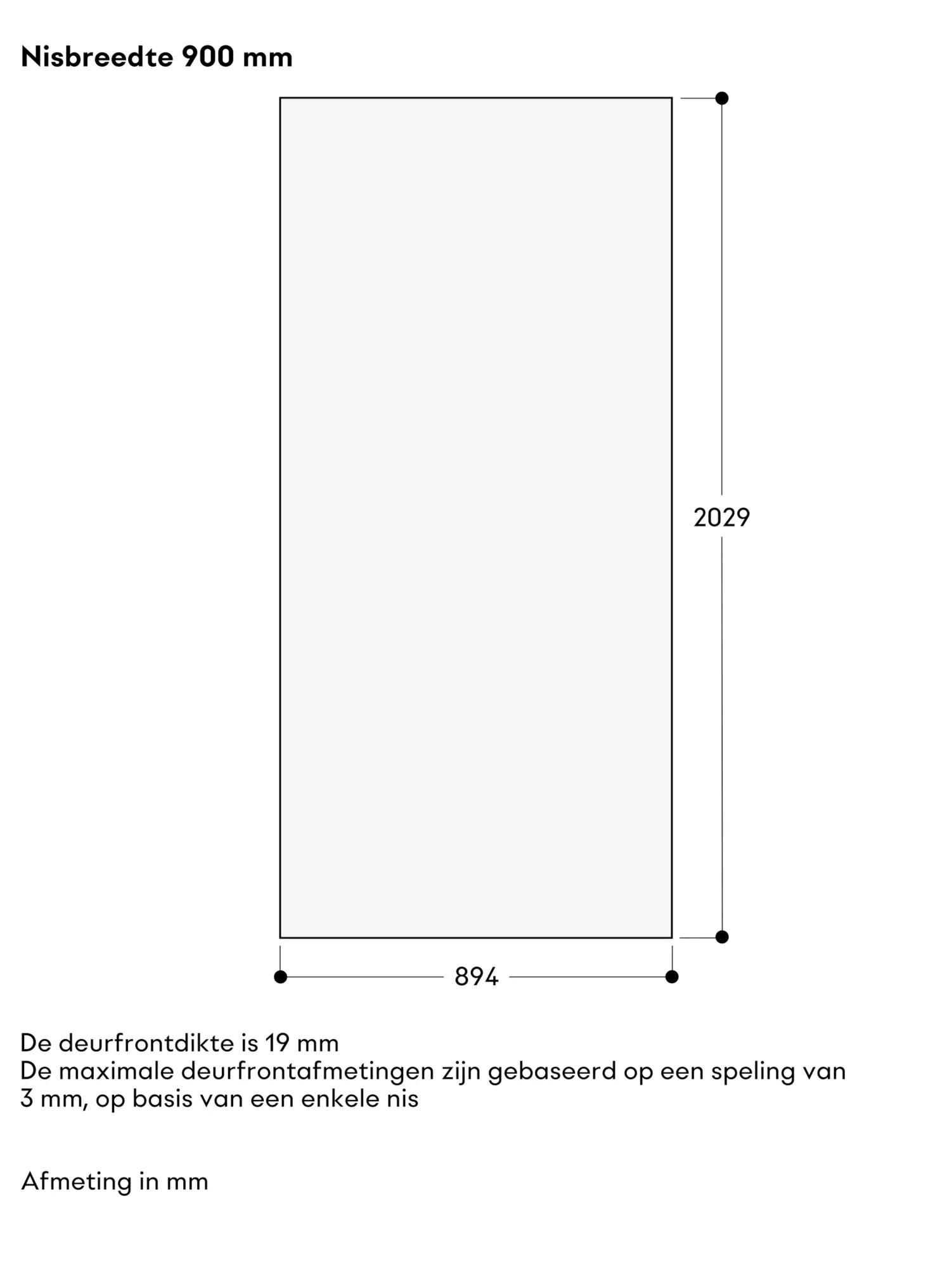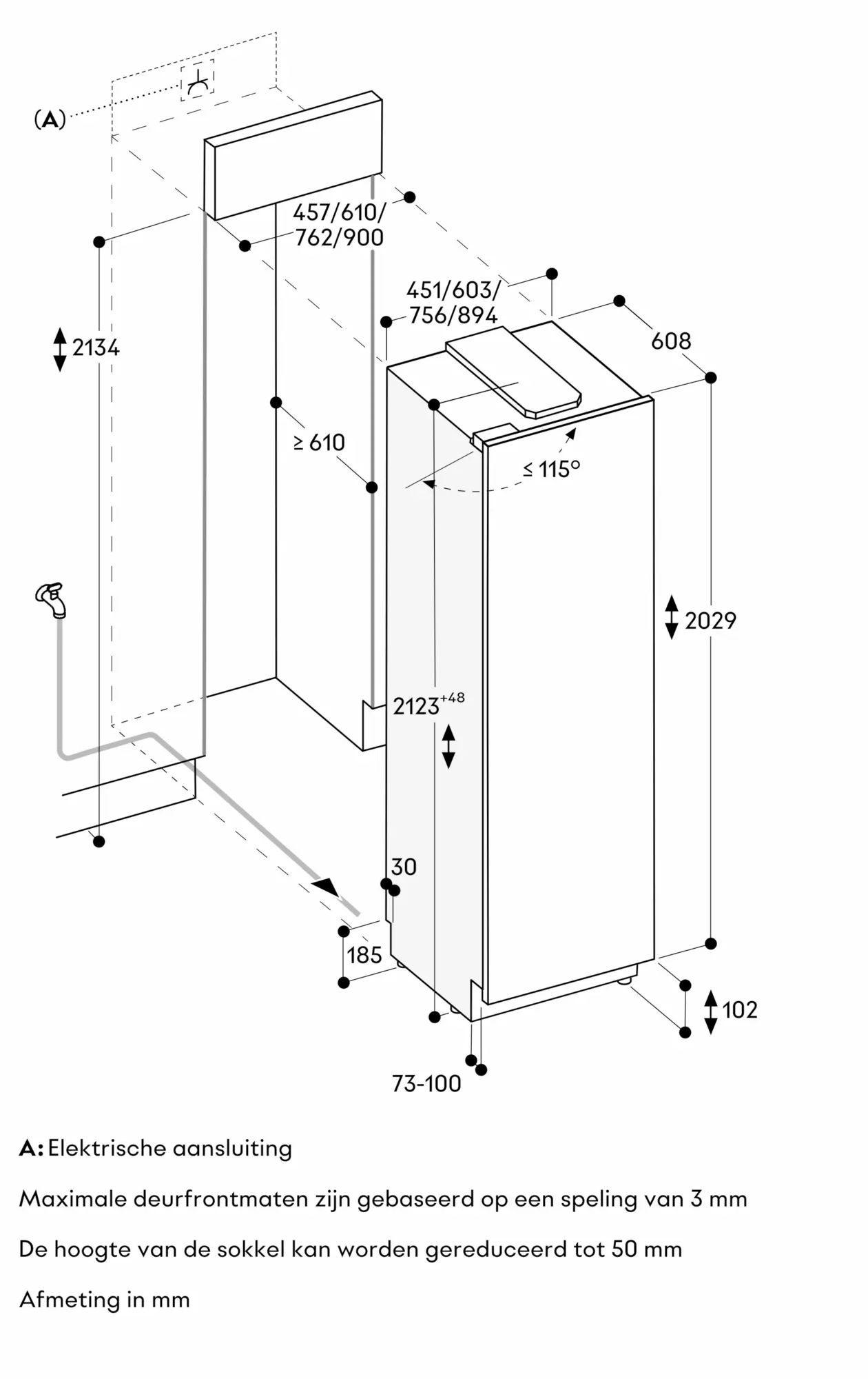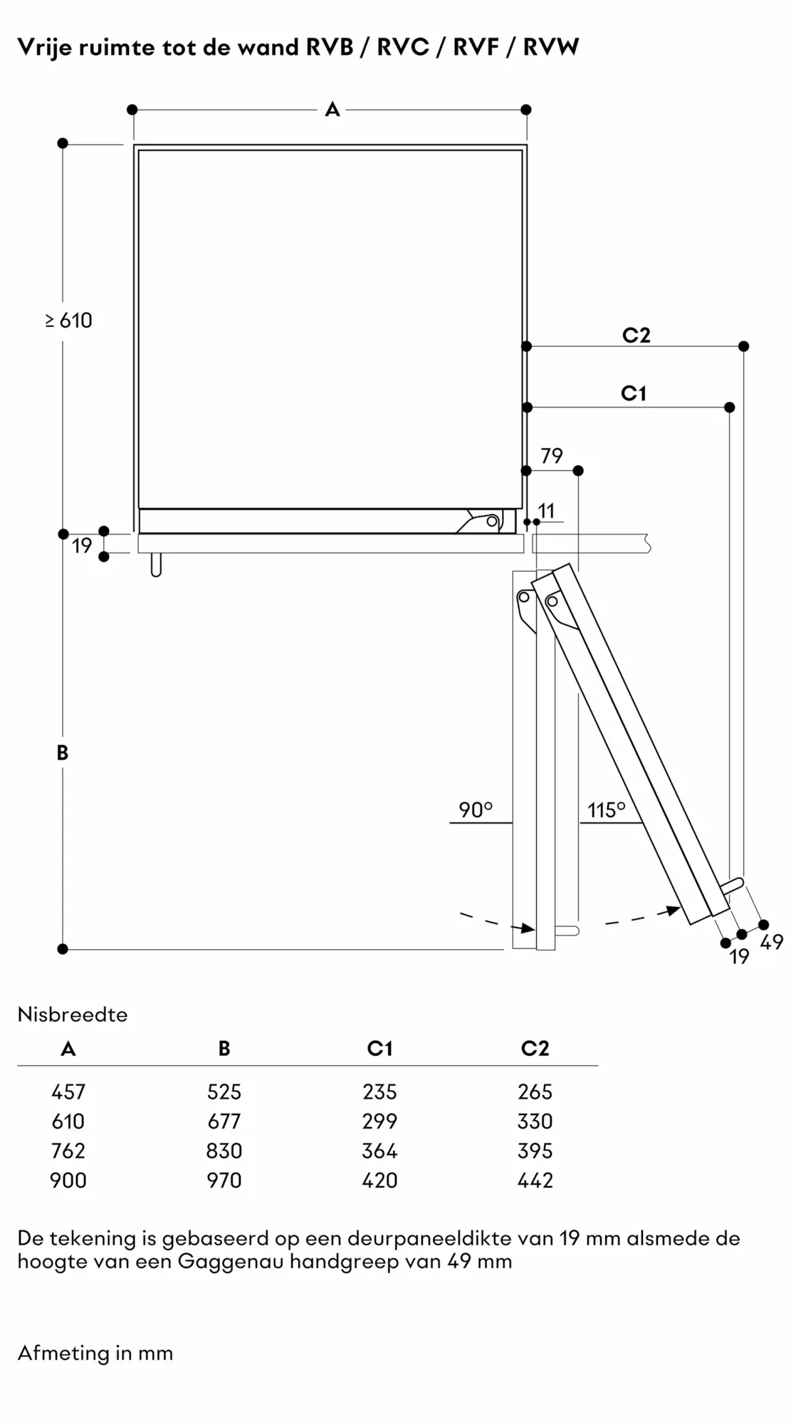 Deuropeningshoek 115°, kan op 90° vergrendeld worden. Bij 90° installatie zijn de laden beperkt toegankelijk.