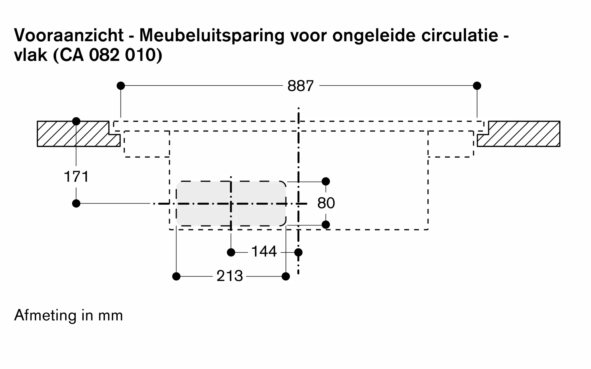 Voor de vrijblazende recirculatieset CA 082 010 is een verticale opening van min. 25 mm achter de acterwand van het meubel nodig. Voor ideale prestaties wordt 50 mm aanbevolen.
