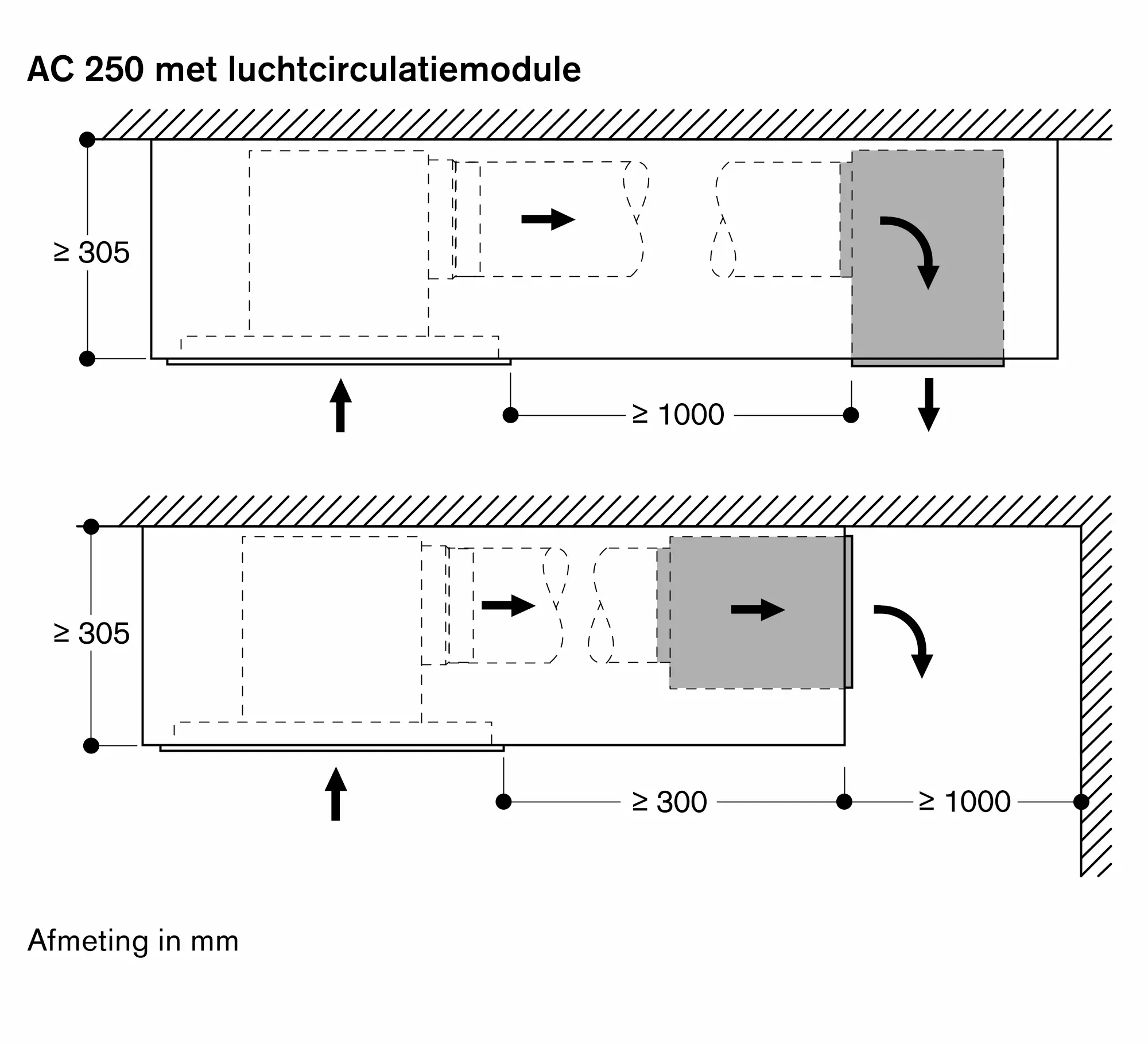 De plafondunit moet worden behandeld als ruimteventilatie wanneer de afstand tot de kookplaat groter is dan 120 cm de directe vangst van dampen zal dan beperkt zijn.
