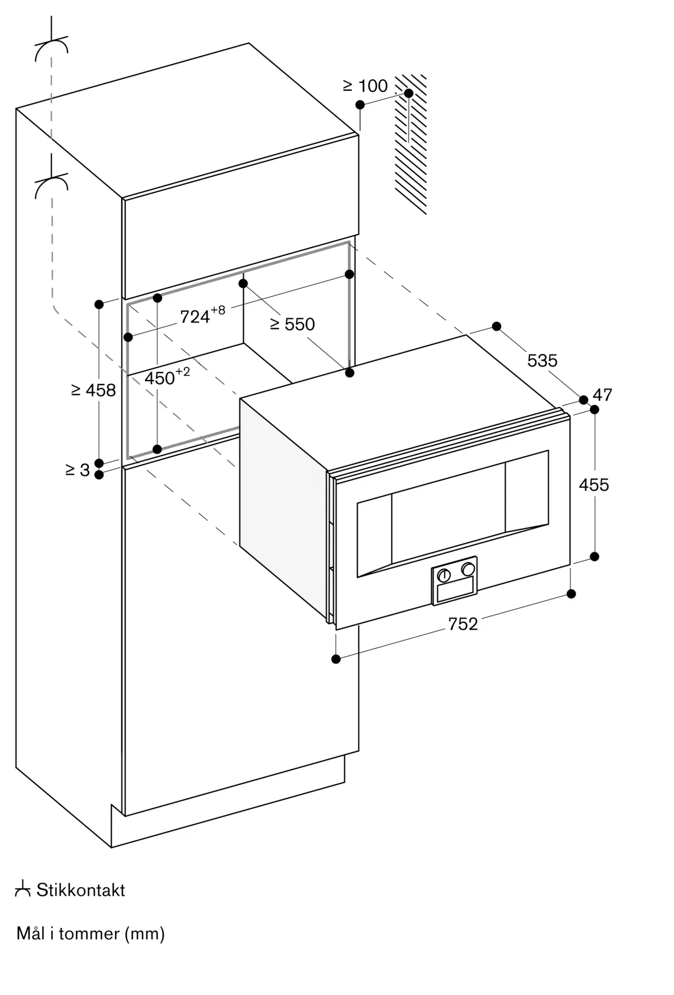Stikkontakten må monteres utenfor innbyggingsnisjen