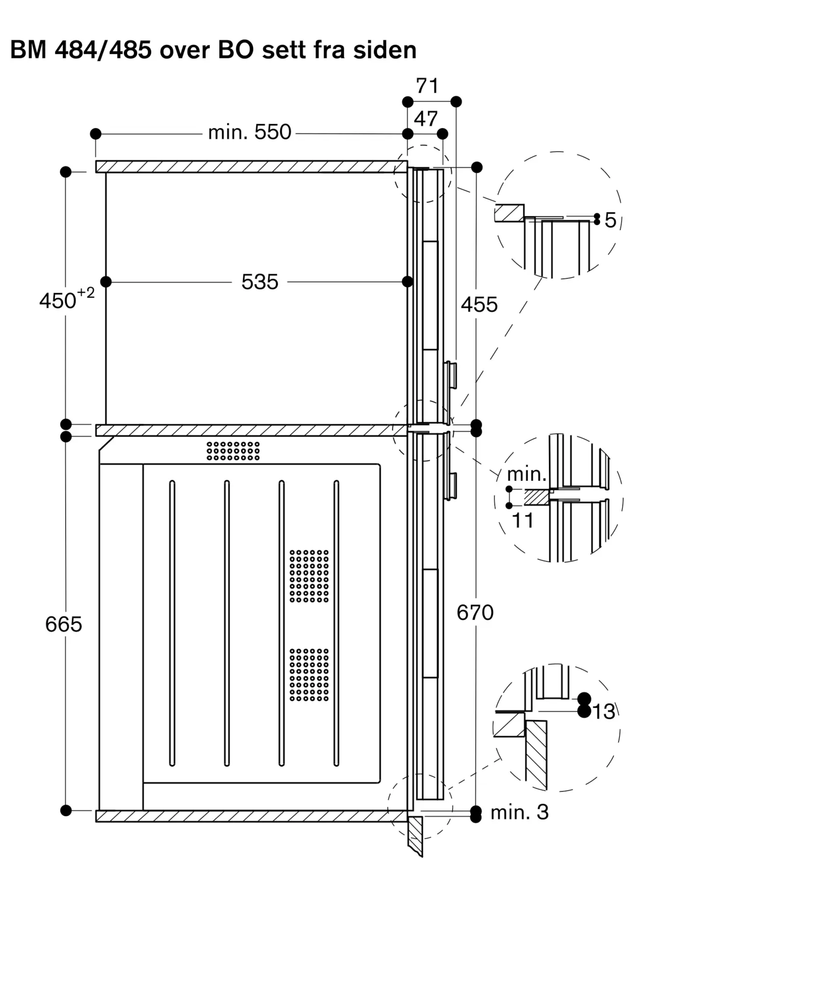 Ta hensyn til den fremspringende fronten (hvis relevant inklusive dørhåndtaket), hvis det finnes åpningsbare skuffer ved siden av apparatet