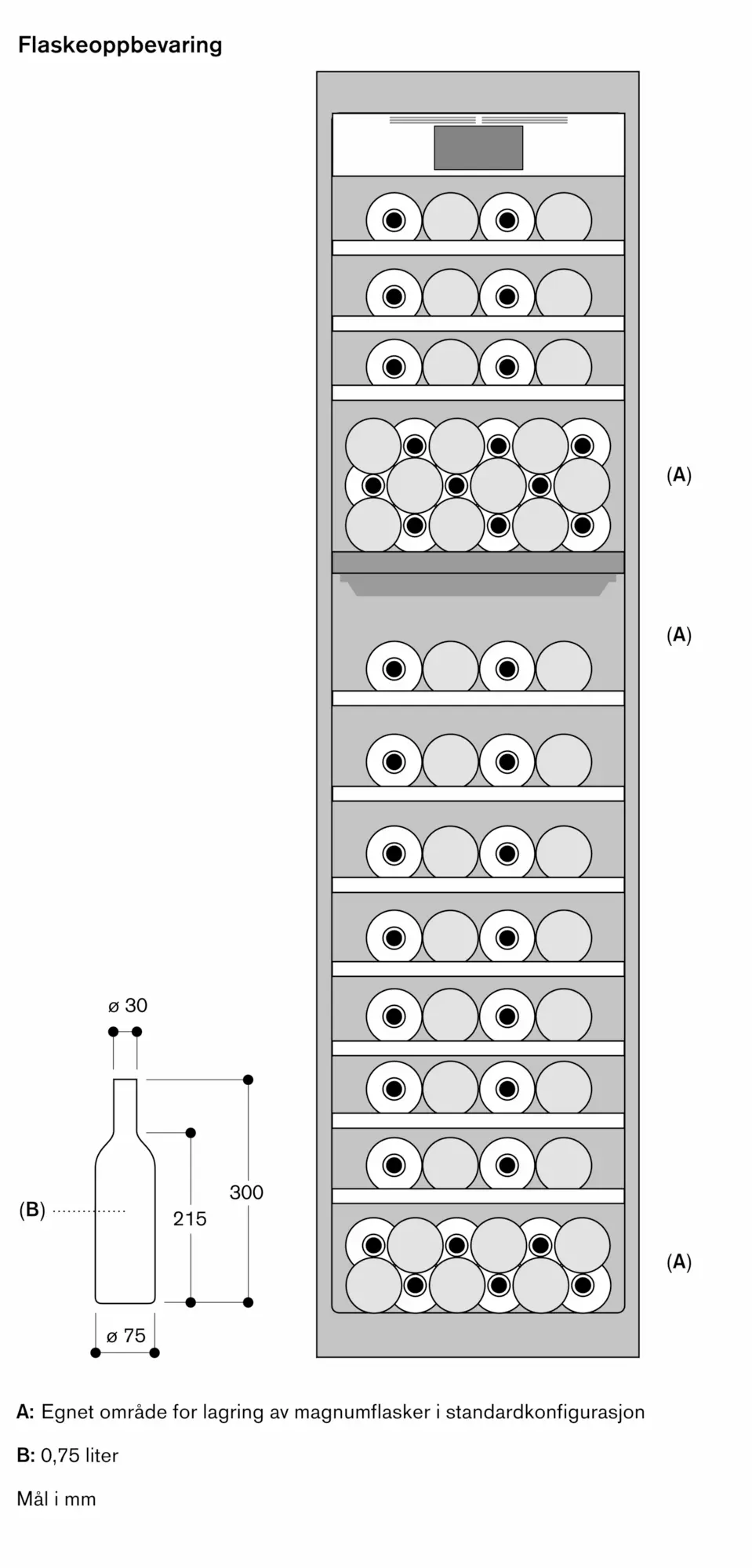 Lagring av opp til 6 Magnum-flaskor med standard hyllekonfigurasjon (12 flaskehyller)