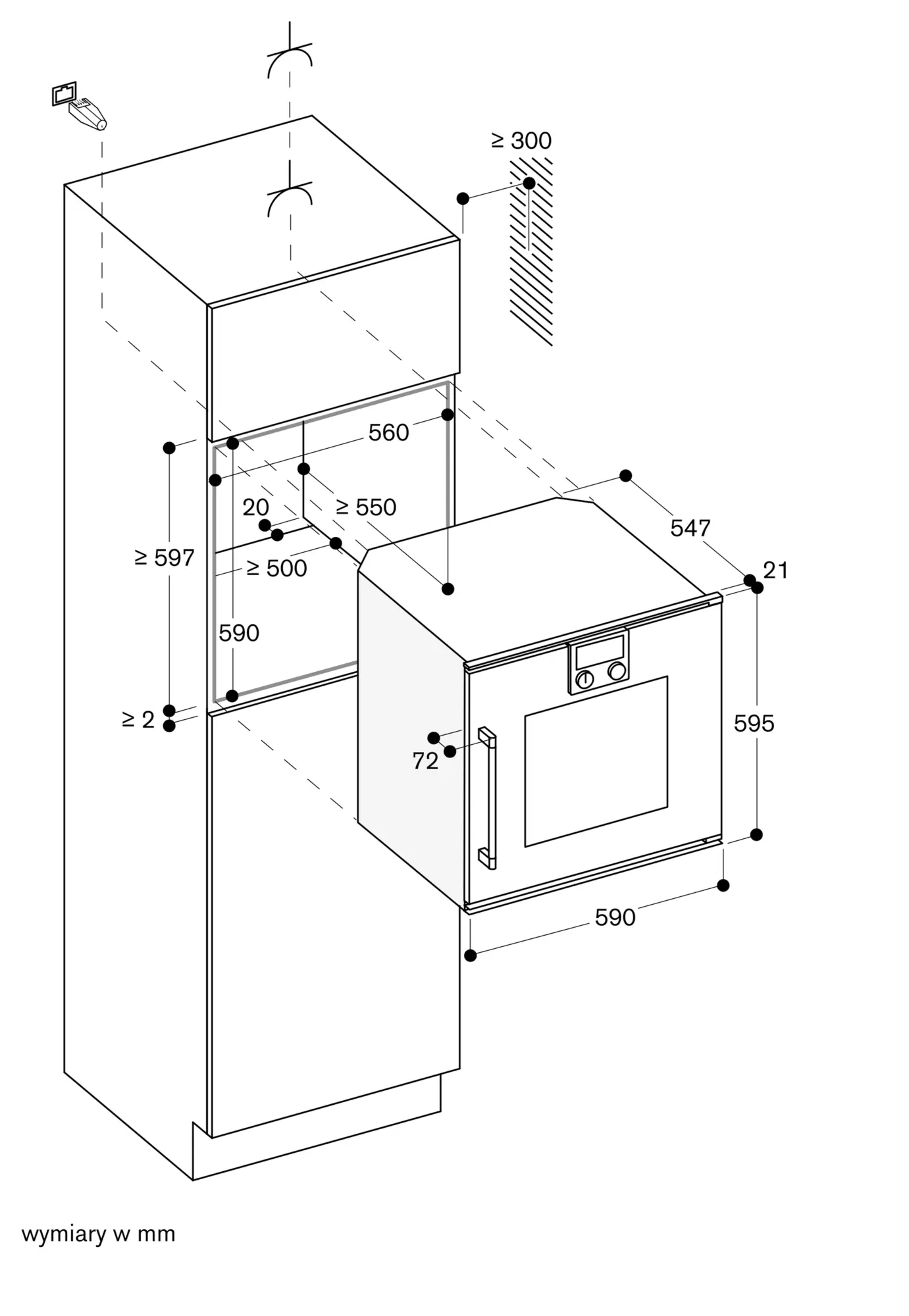 Gniazdko elektryczne musi być umiejscowione poza obszarem wnęki do zabudowy