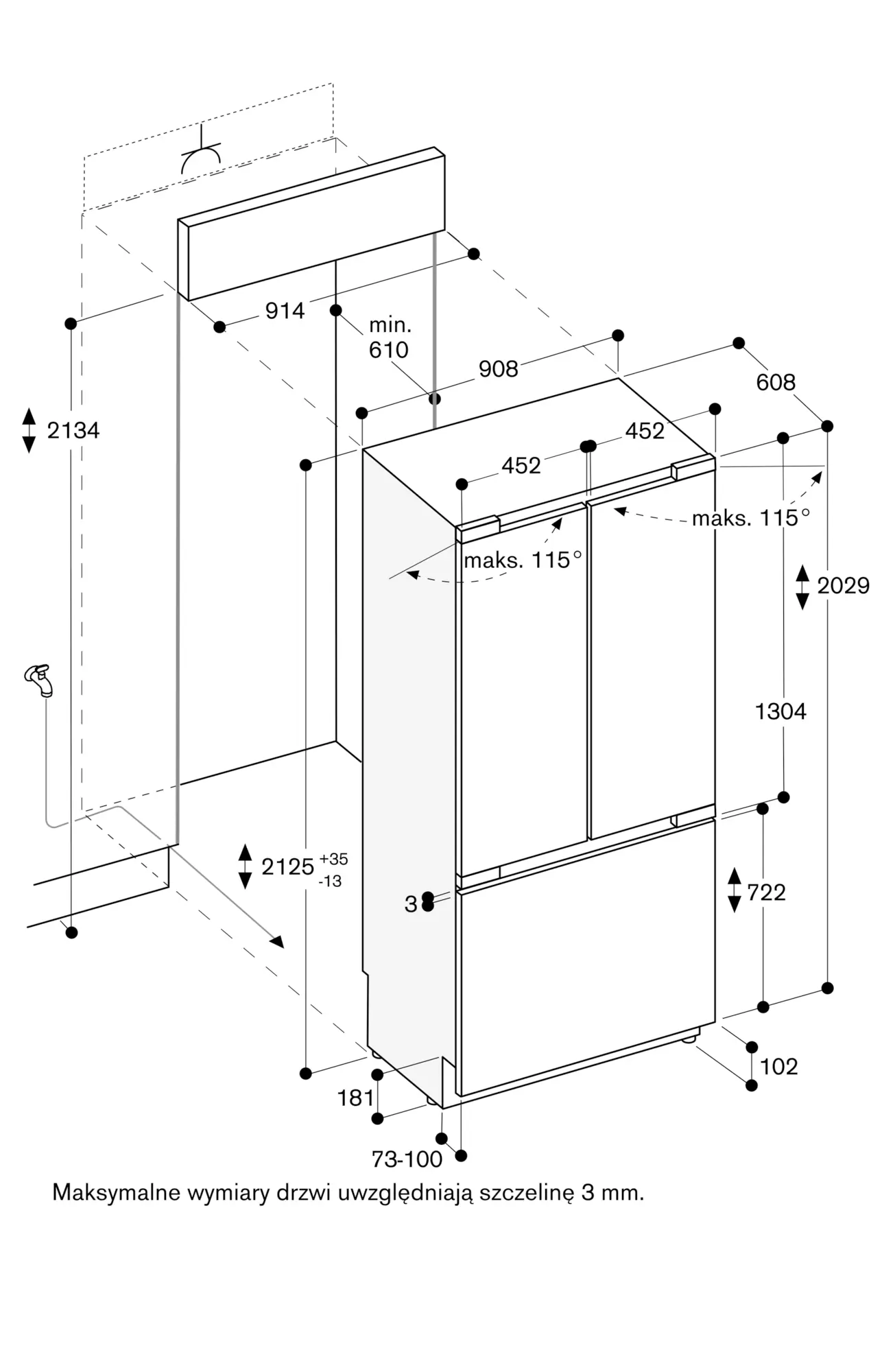 Kąt otwarcia drzwi 115°, możliwość blokady 90°