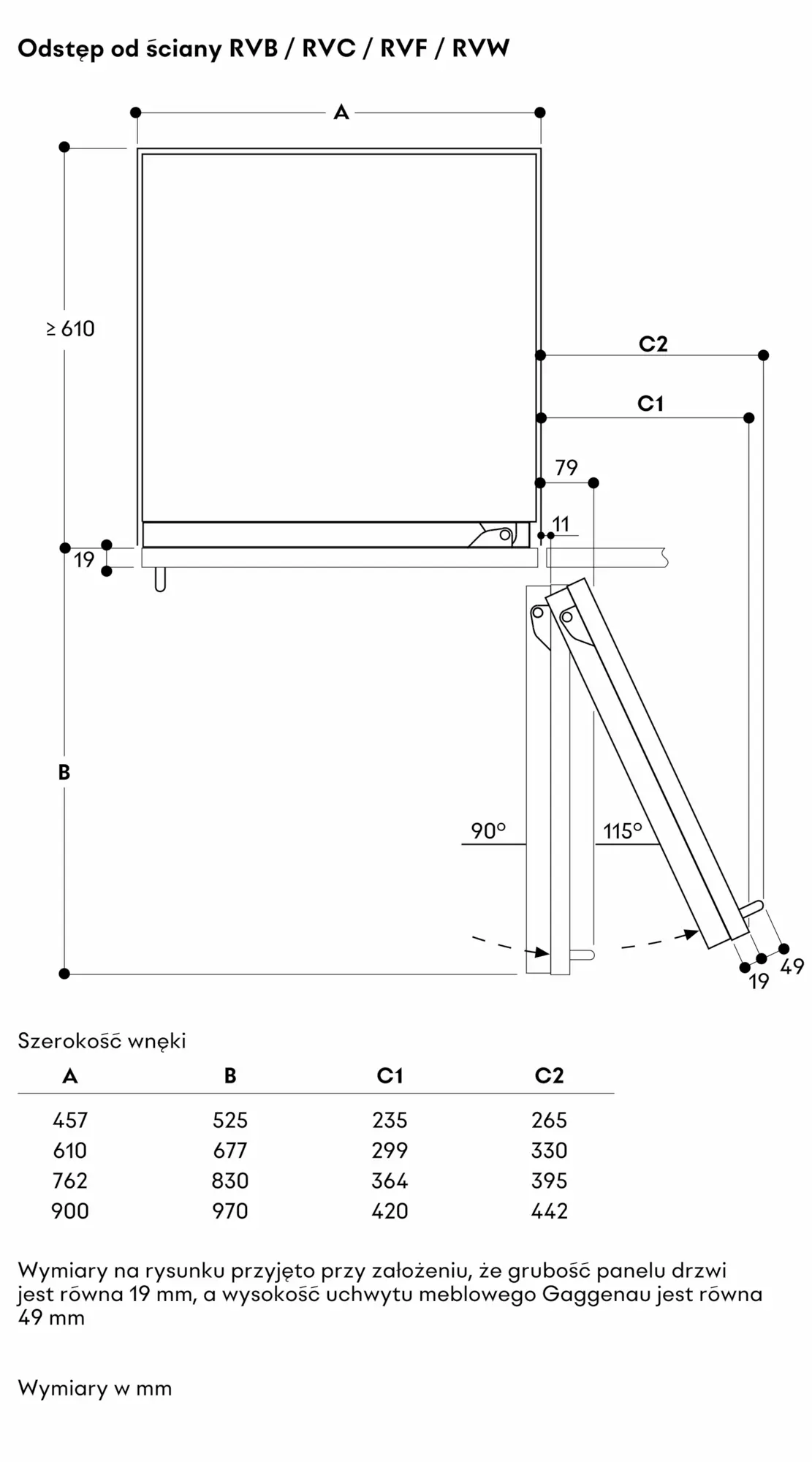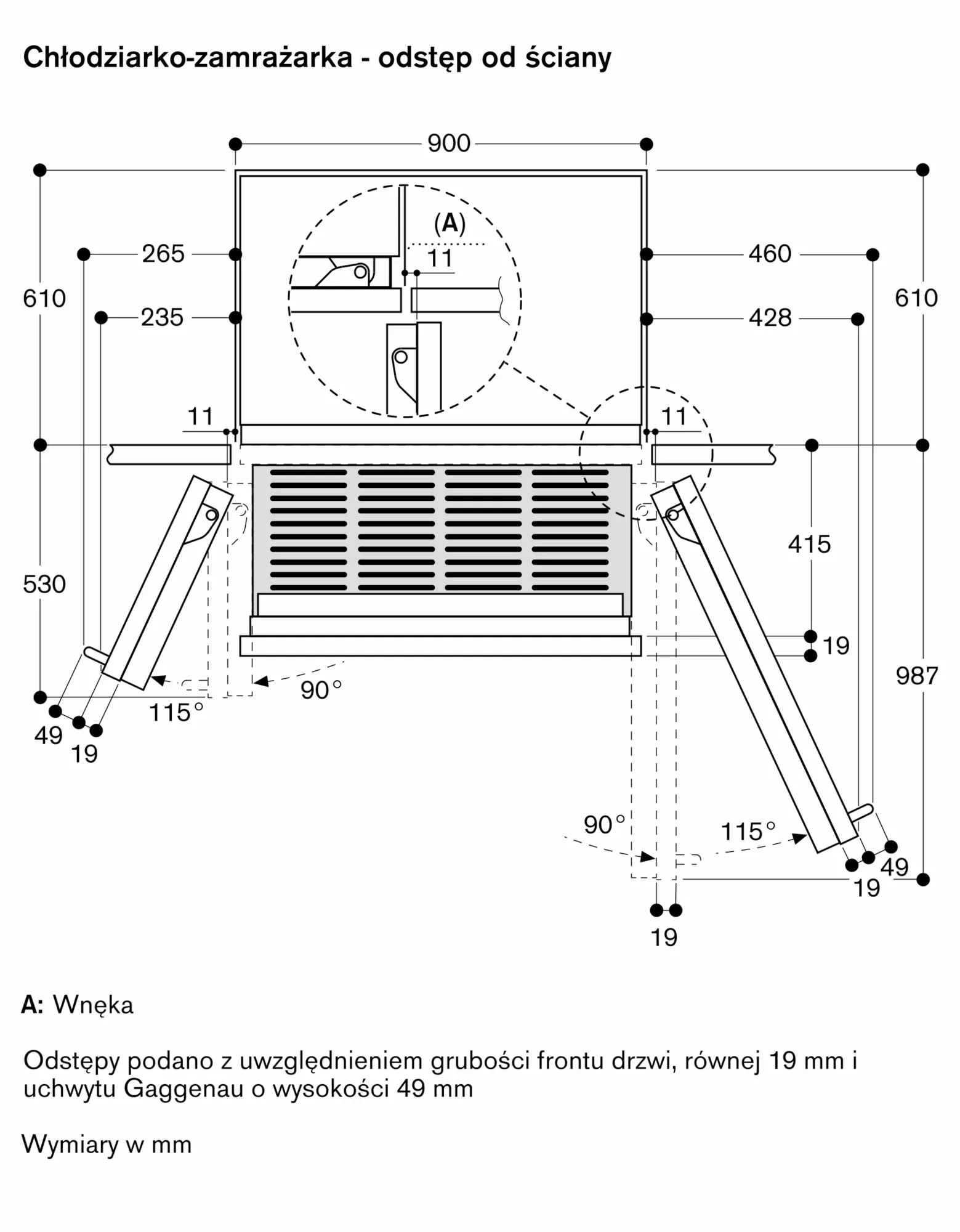 Kąt otwarcia drzwi 115°, możliwość blokady 90°