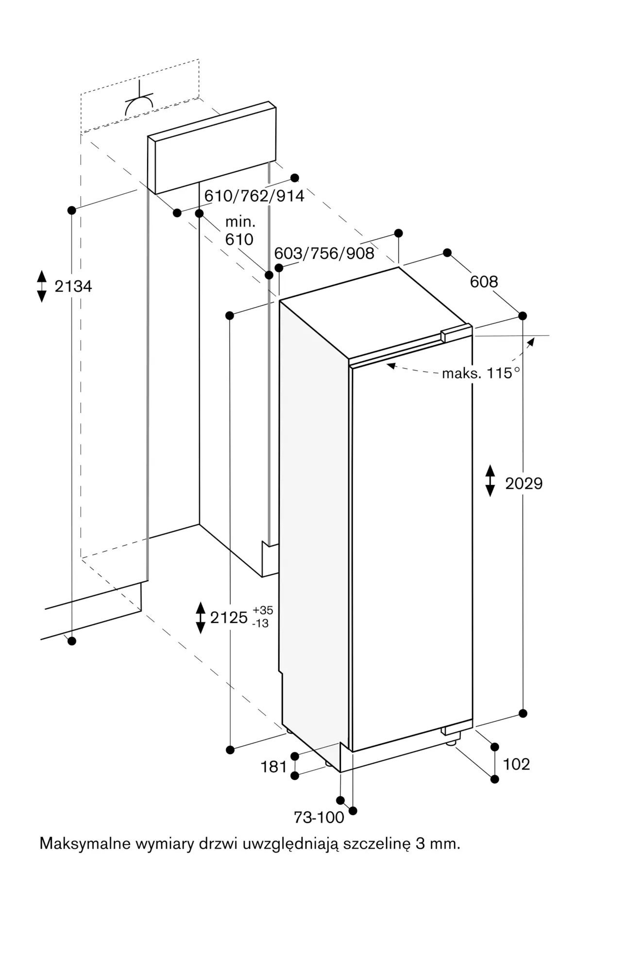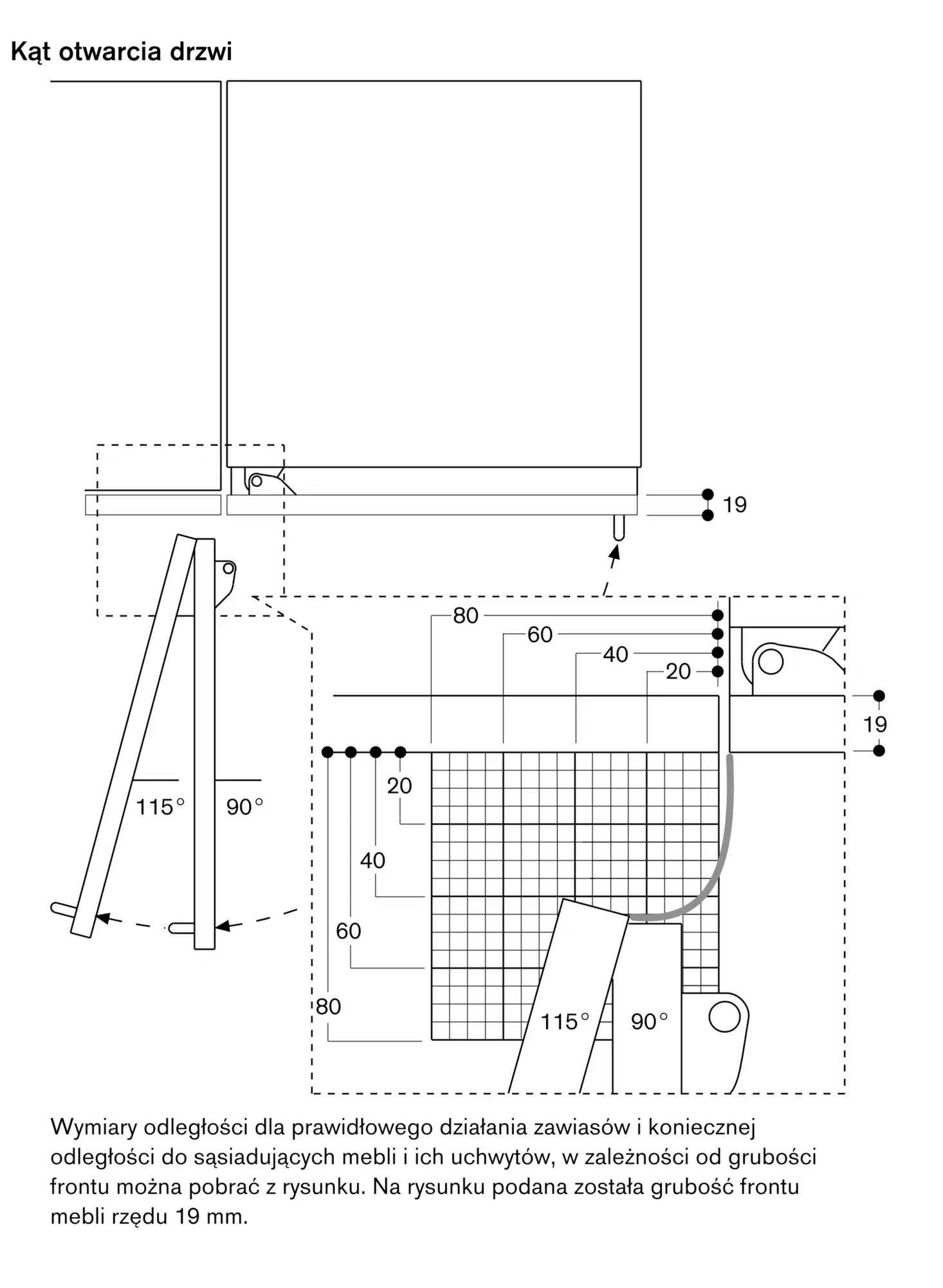 Kąt otwarcia drzwi 115°, możliwość blokady 90°
