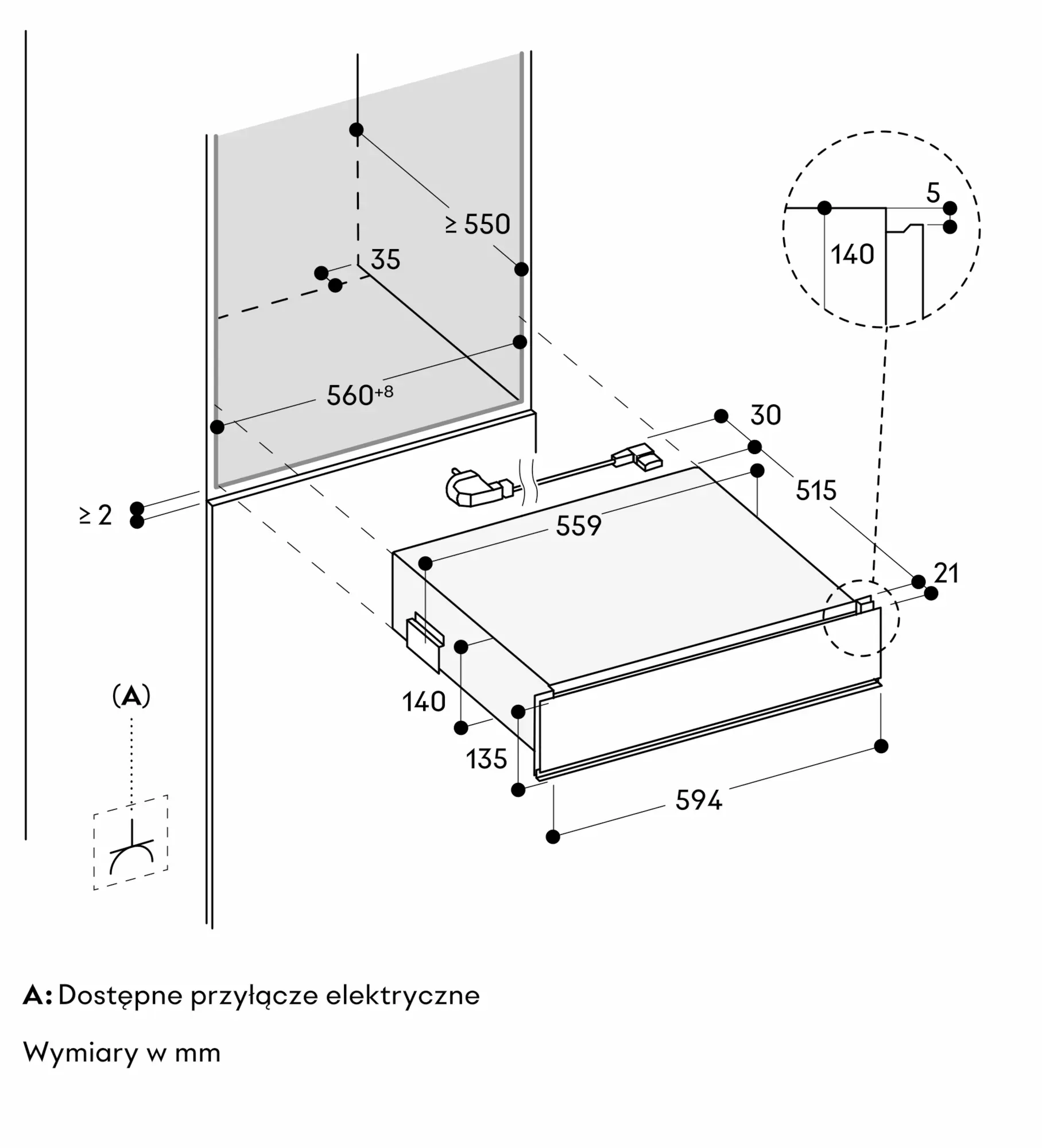 Występ od frontu urządzenia do obudowy meblowej 21 mm.