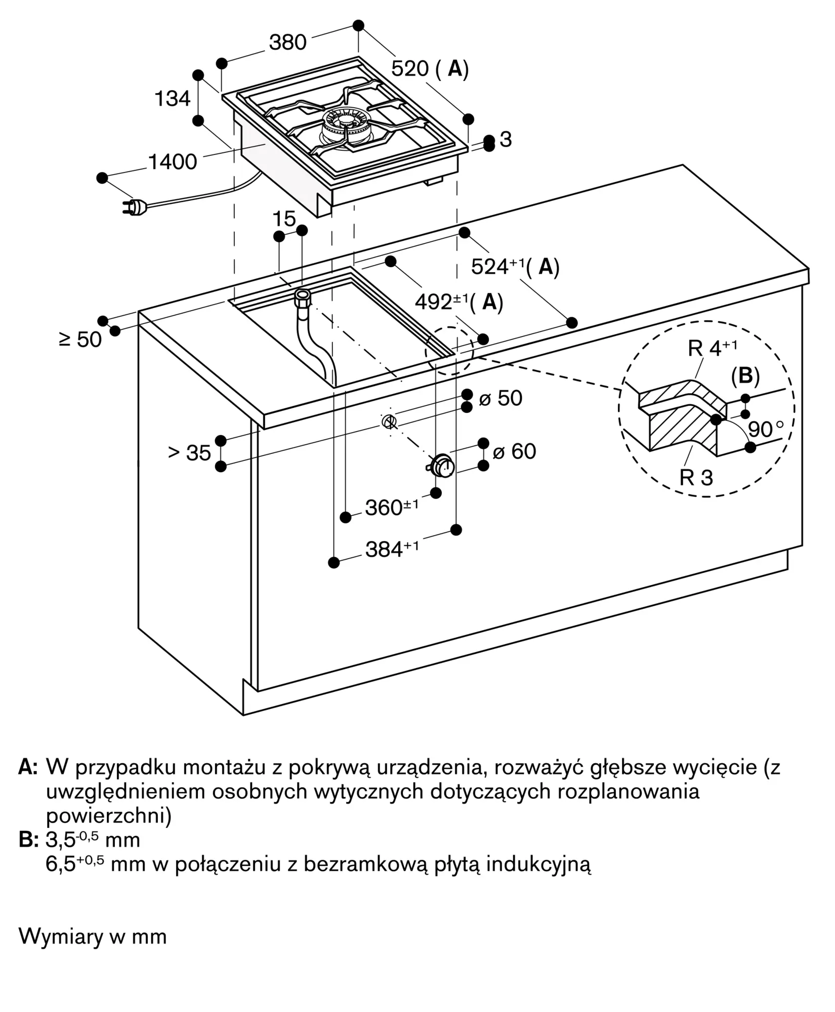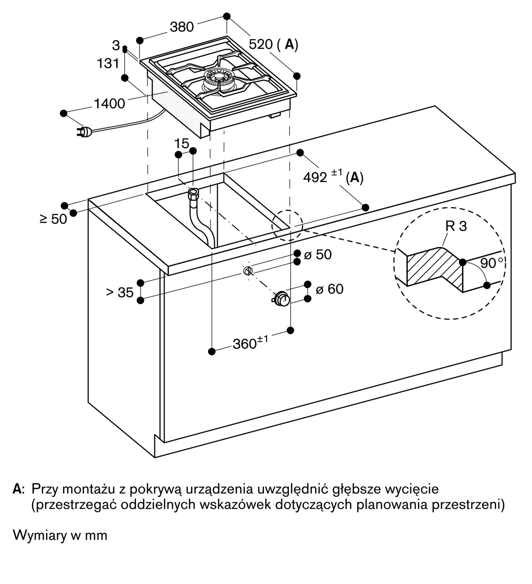 Zależnie od rodzaju montażu (montaż na blacie lub równo z blatem, urządzenie z lub bez pokrywy ) lokalizacja wycięcia oraz pozycje pokręteł mogą się różnić.