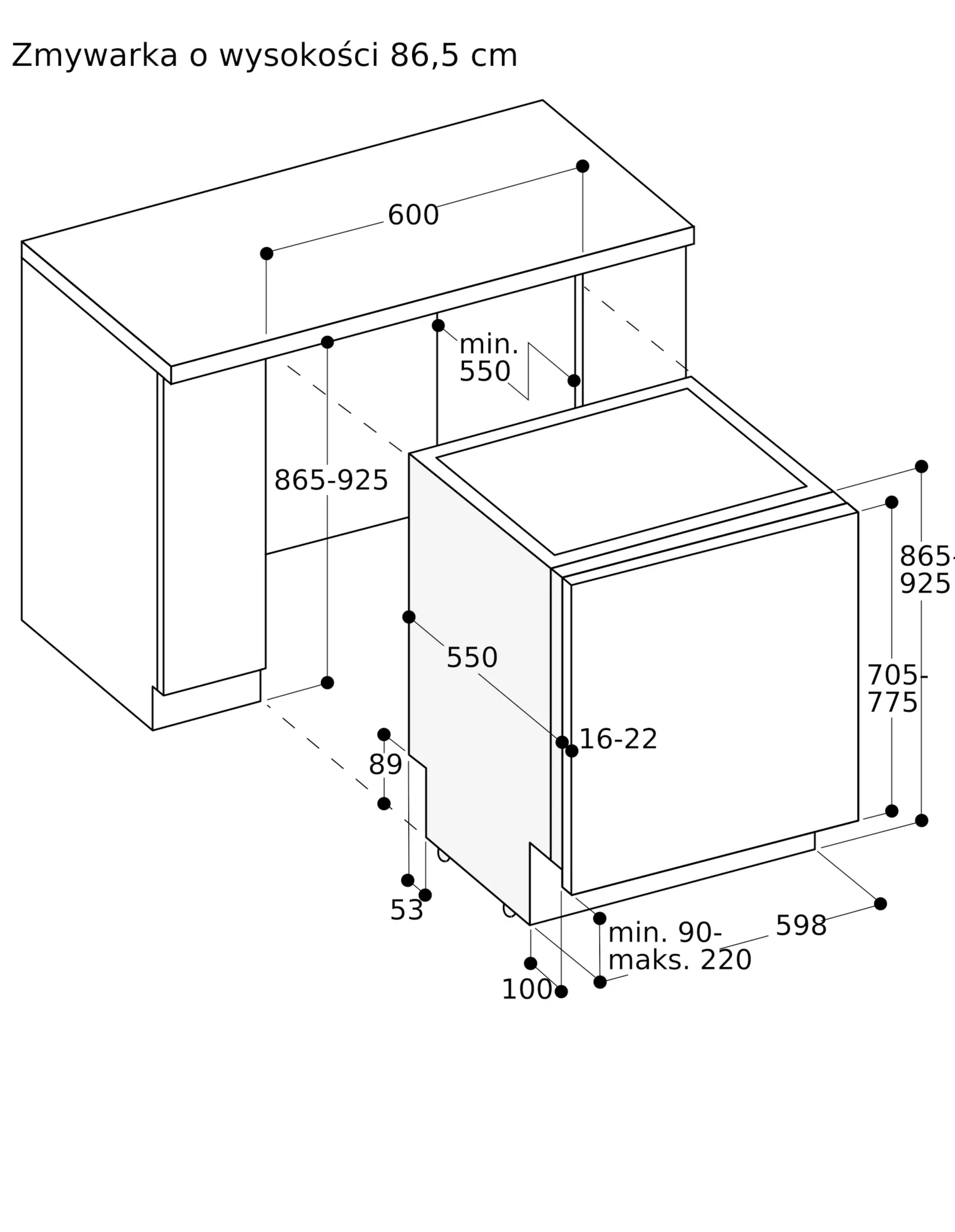 Aby wyświetlić pozostały czas do końca programu, musi zostać zachowana określona grubość cokołu (40mm+grubość frontu meblowego)