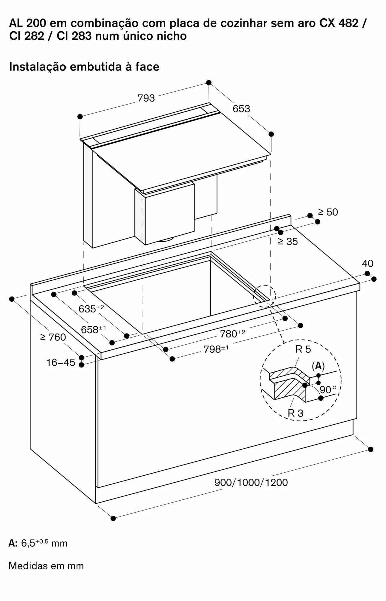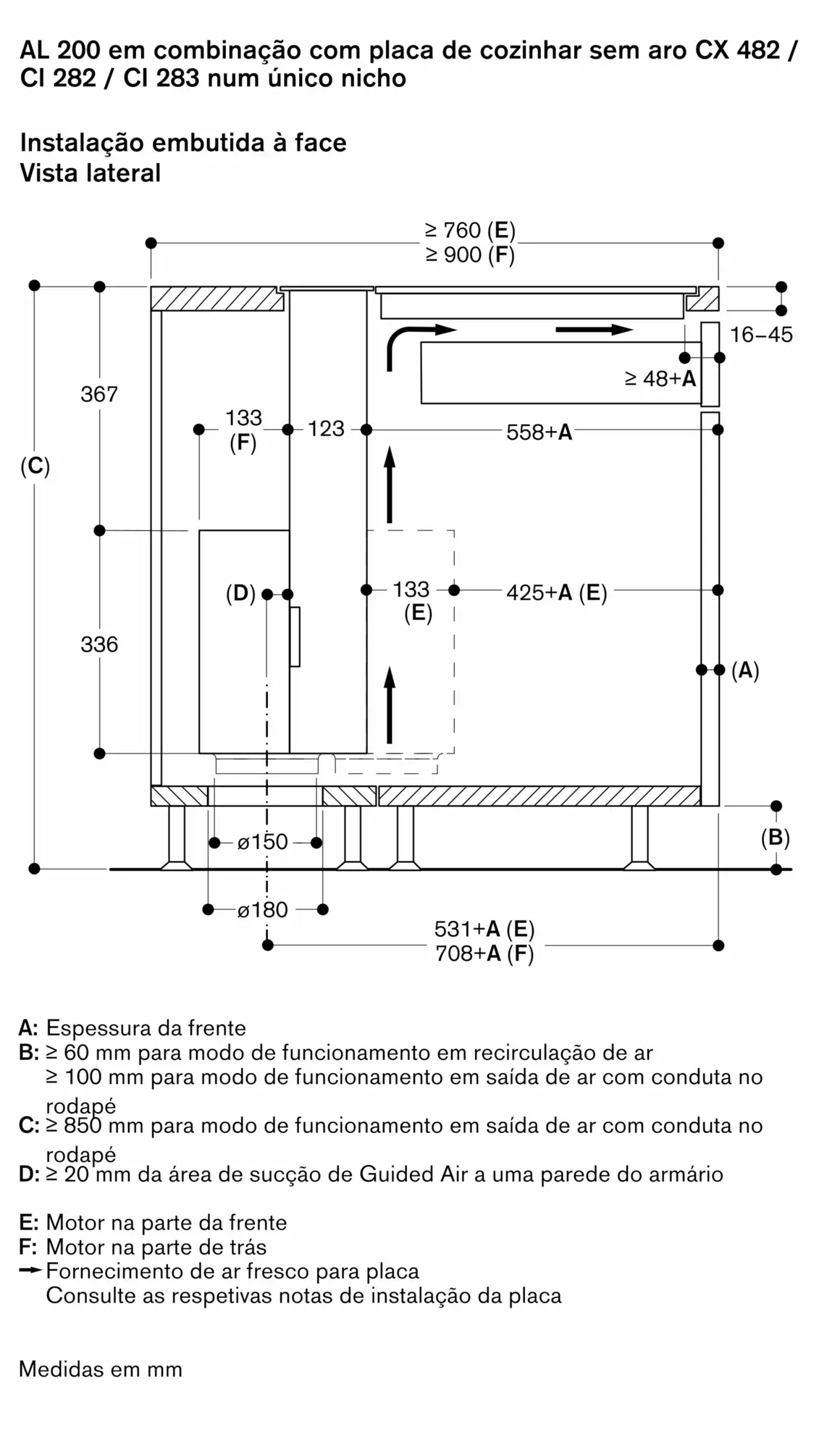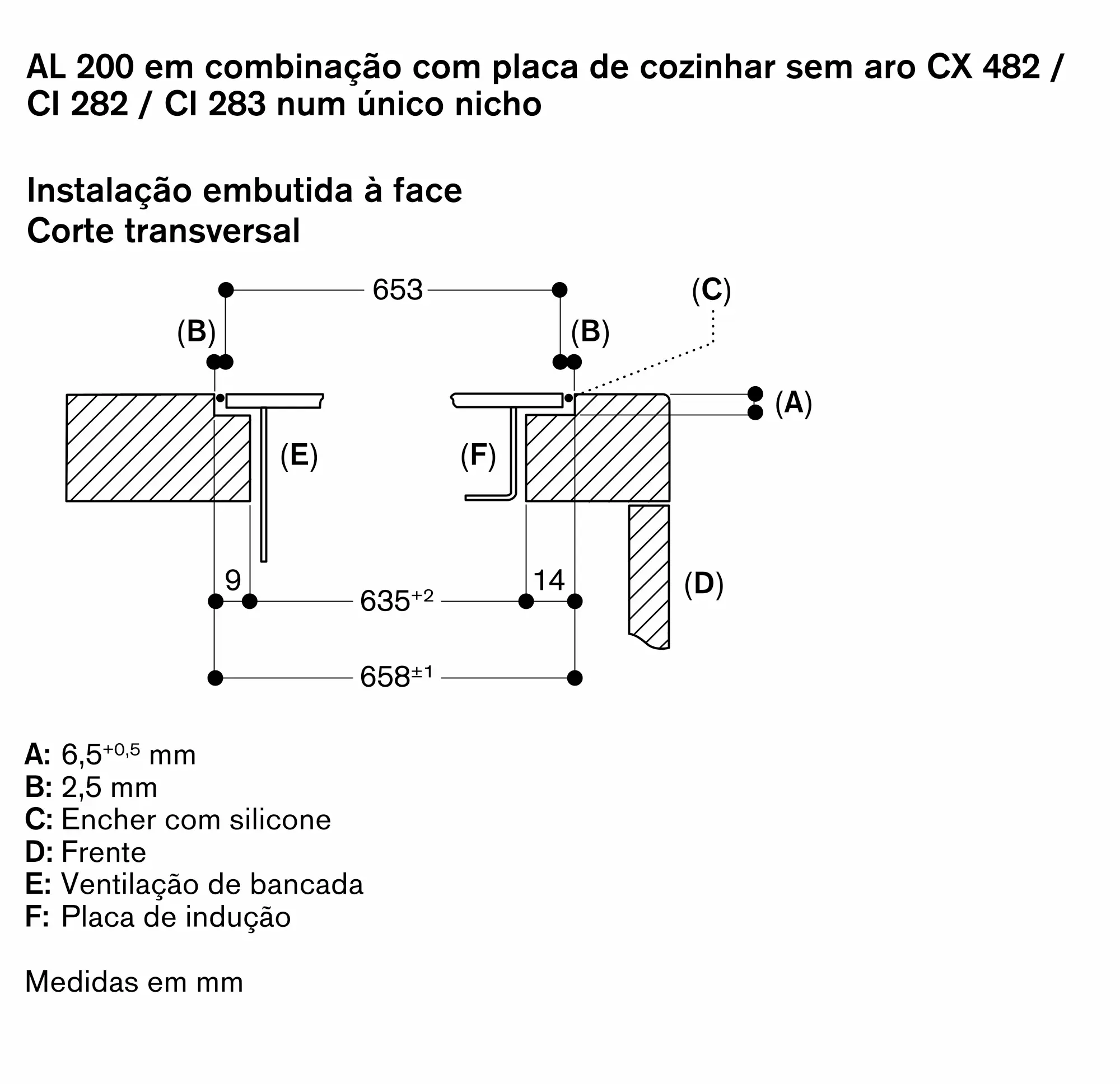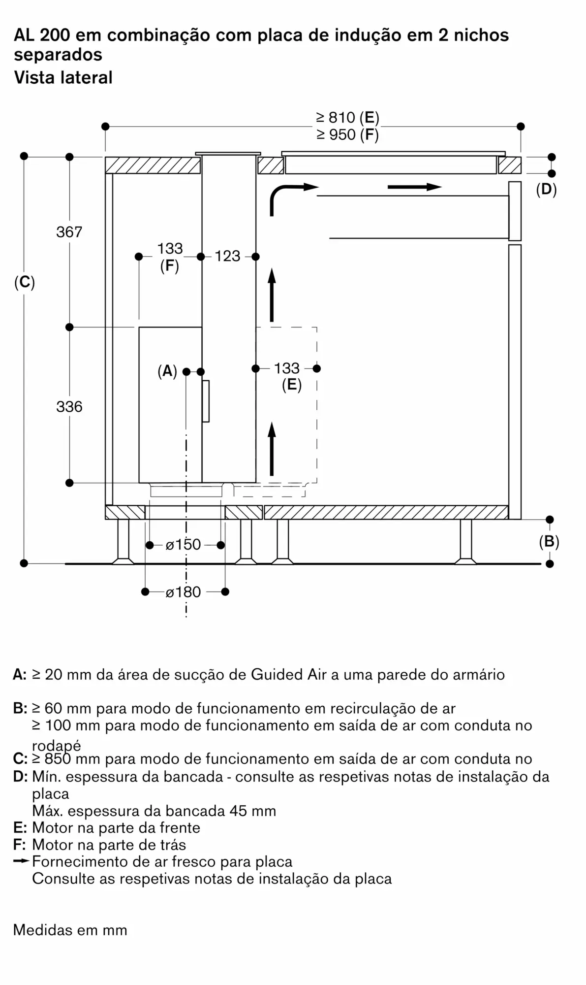 A seguinte distância deve ser respeitada: - 50 cm à esquerda e à direita da ventilação da mesa para a parede ou armários altos laterais. - 5 cm da moldura de ventilação da mesa à parede. - 2 cm da área de sucção do ar guiado até a parede de um dos móveis.