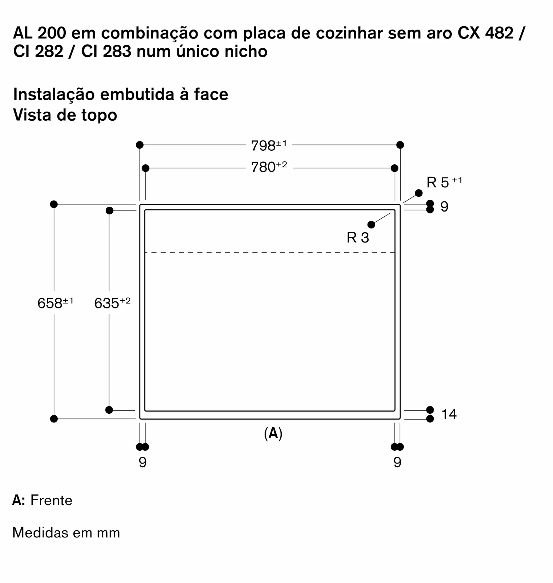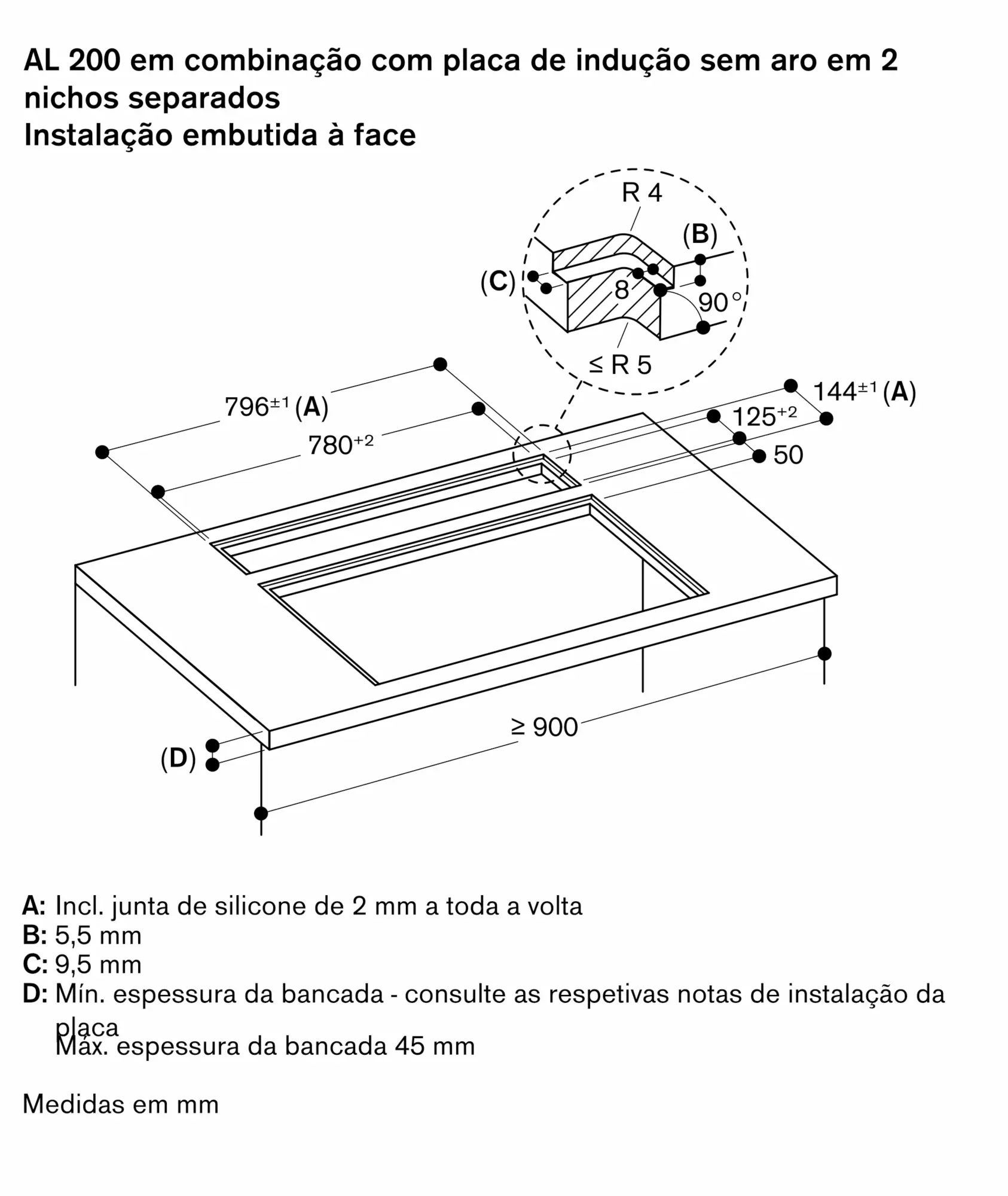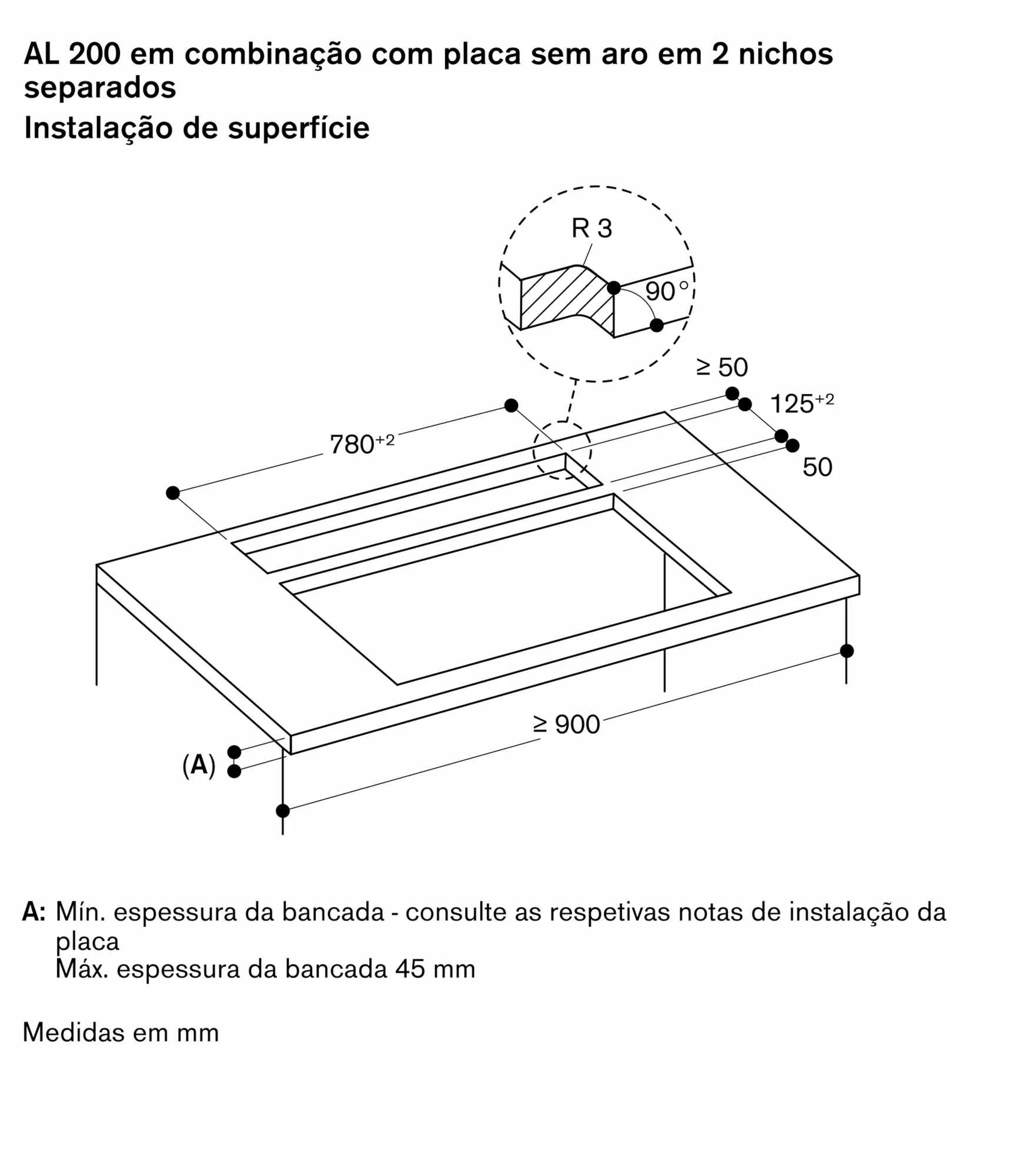 Compatível com placas de indução Serie 400 (CX 482 / VI 482) ou Serie 200 (CI 282 / CI 283), com dois cortes independentes na bancada para uma instalação à superfície.