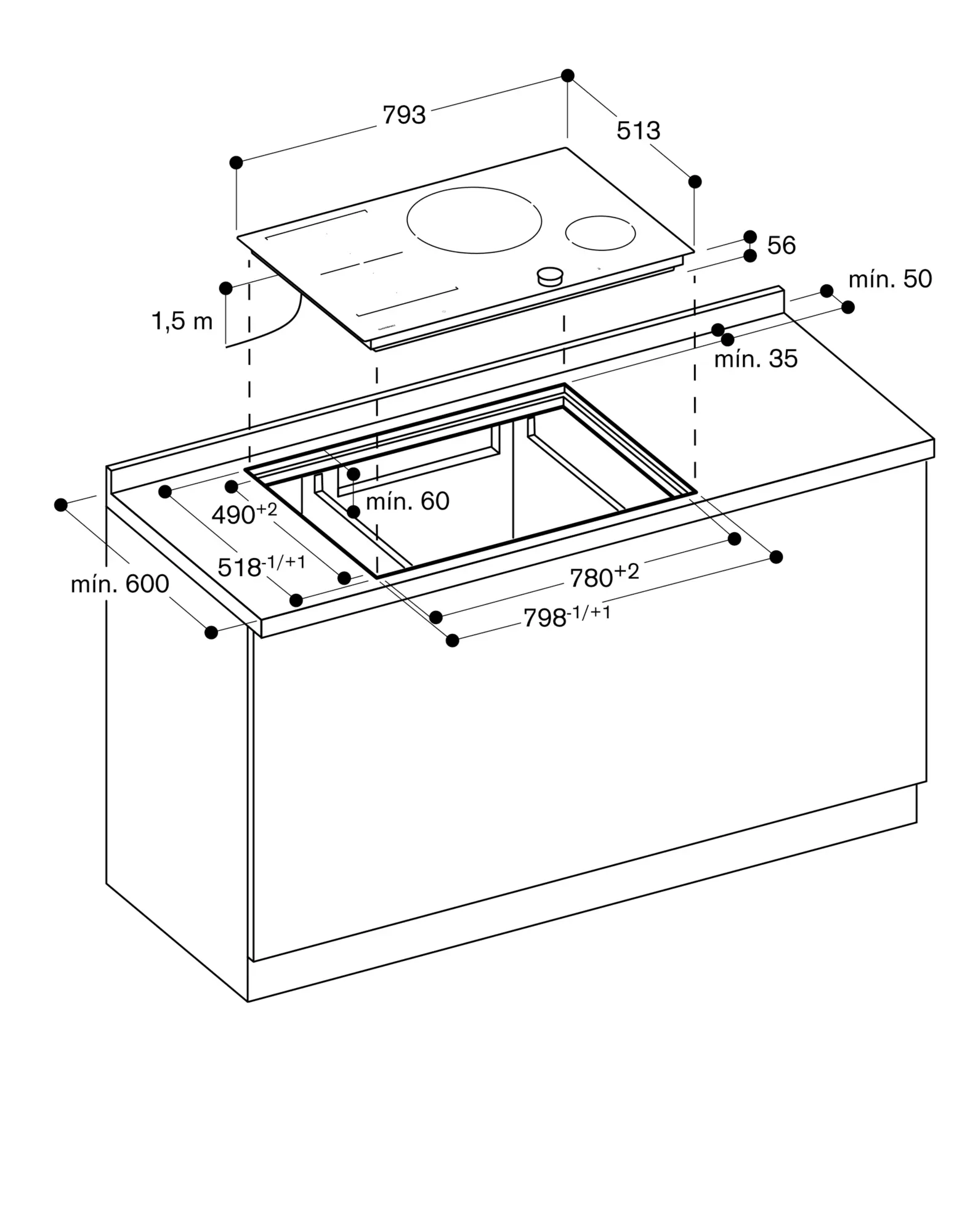1 zona de indução de ø 15 cm (1400 W, com booster 2200 W).