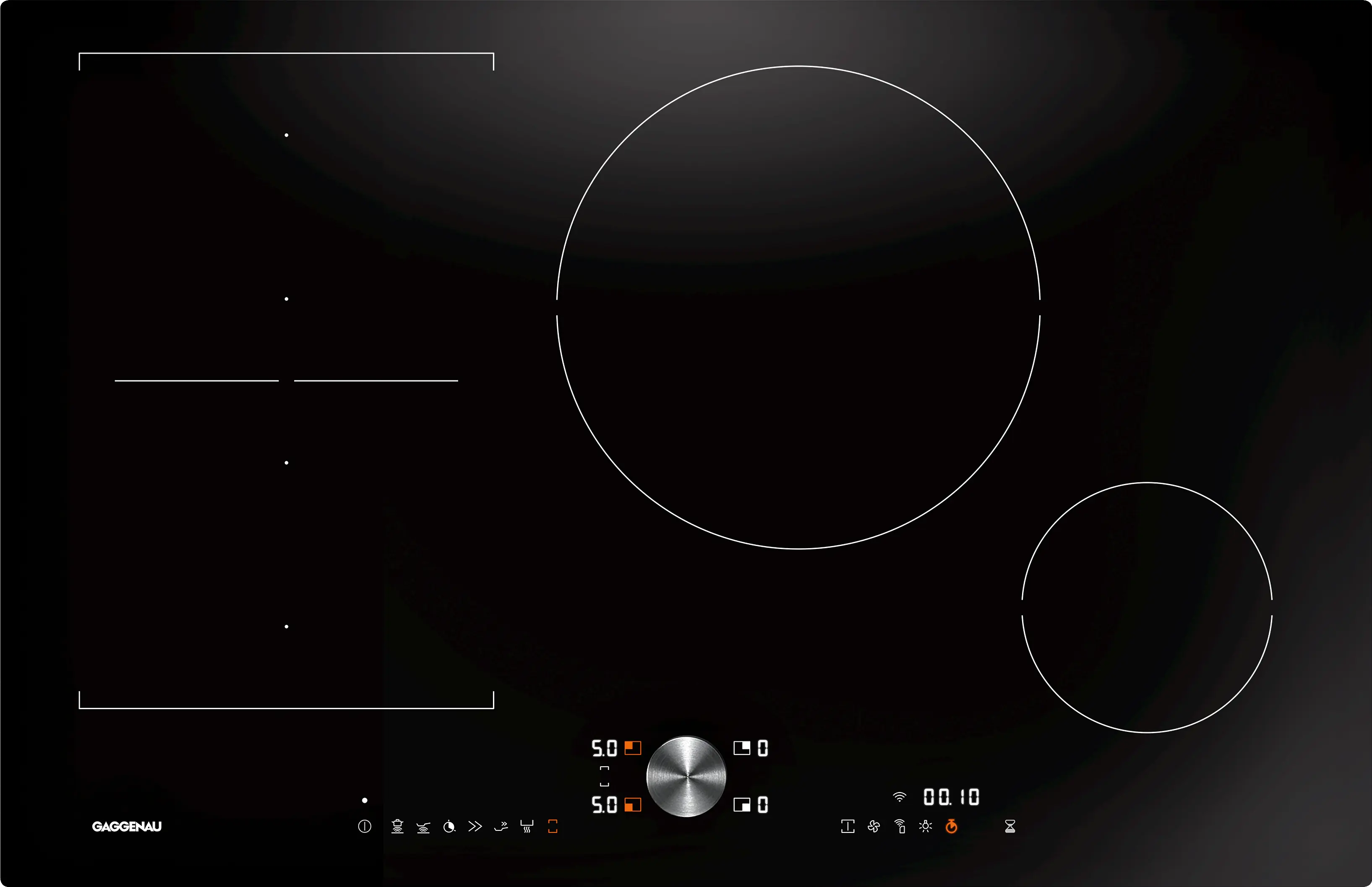 2 zonas flexinductions de 19x24 cm (2200 W, com booster 3700 W), juntas ficam 38x24 cm (3300 W, com booster 3700 W).