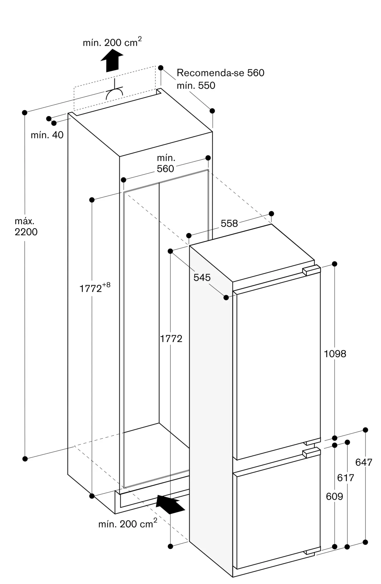 Peso máximo da porta: Porta superior 14 kg. Porta inferior 19 kg.
