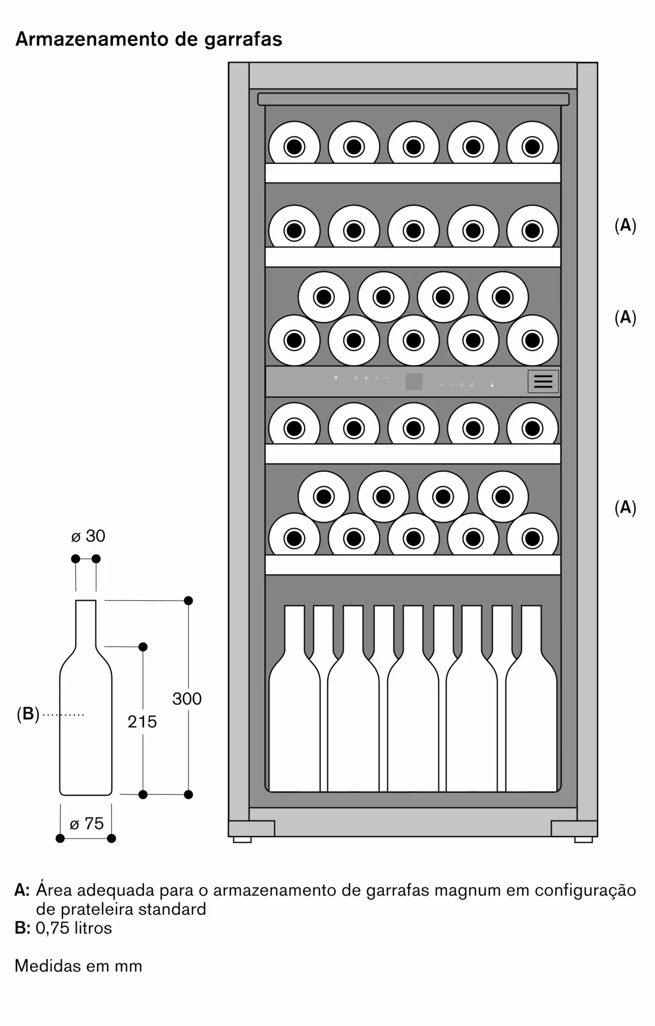 6 prateleiras para garrafas, das quais 4 são extraíveis.