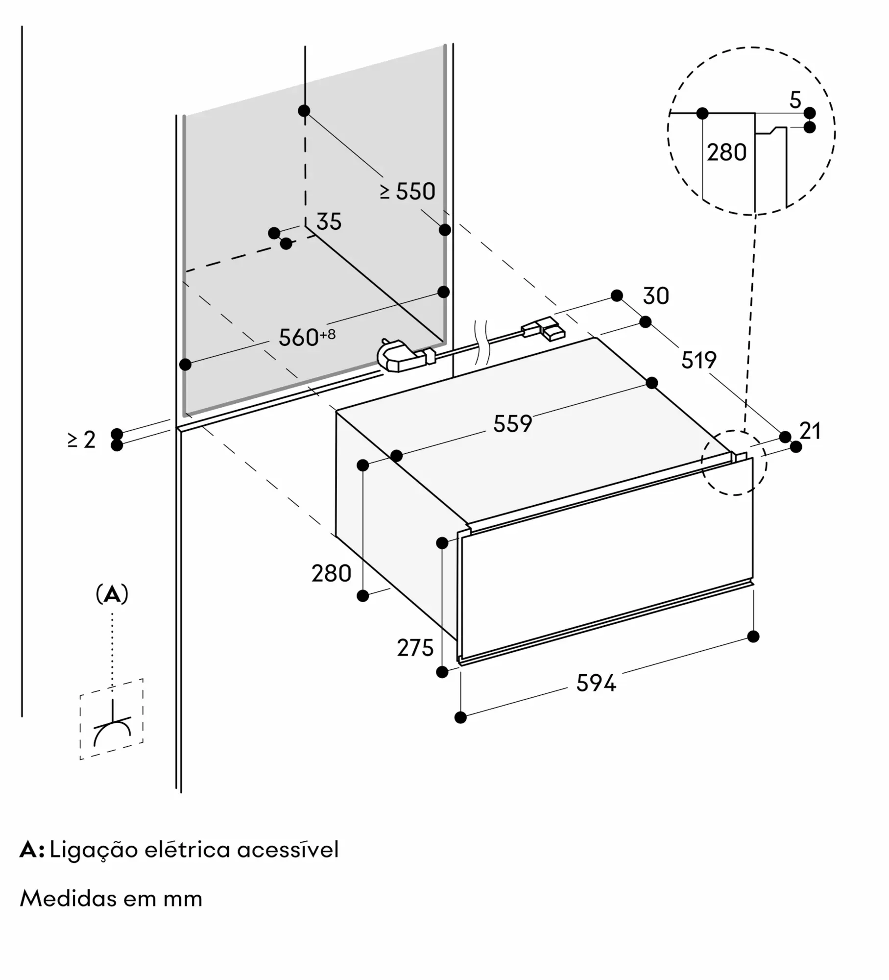 Protrusão da frente do aparelho até ao armário do móvel de 21 mm.