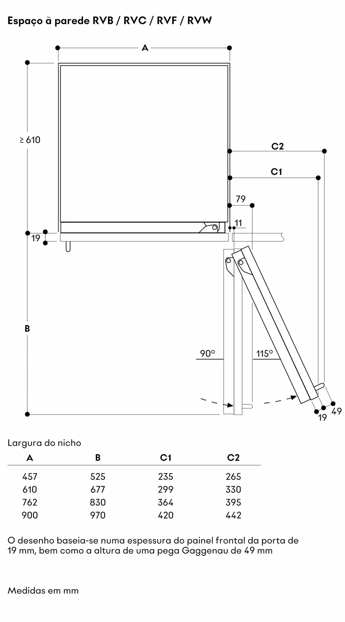 As gavetas nos modelos RVC e RVF estão posicionadas à mesma altura. Com a instalação lado a lado, as prateleiras de vidro e os suportes de porta podem ser alinhados ao mesmo nível.