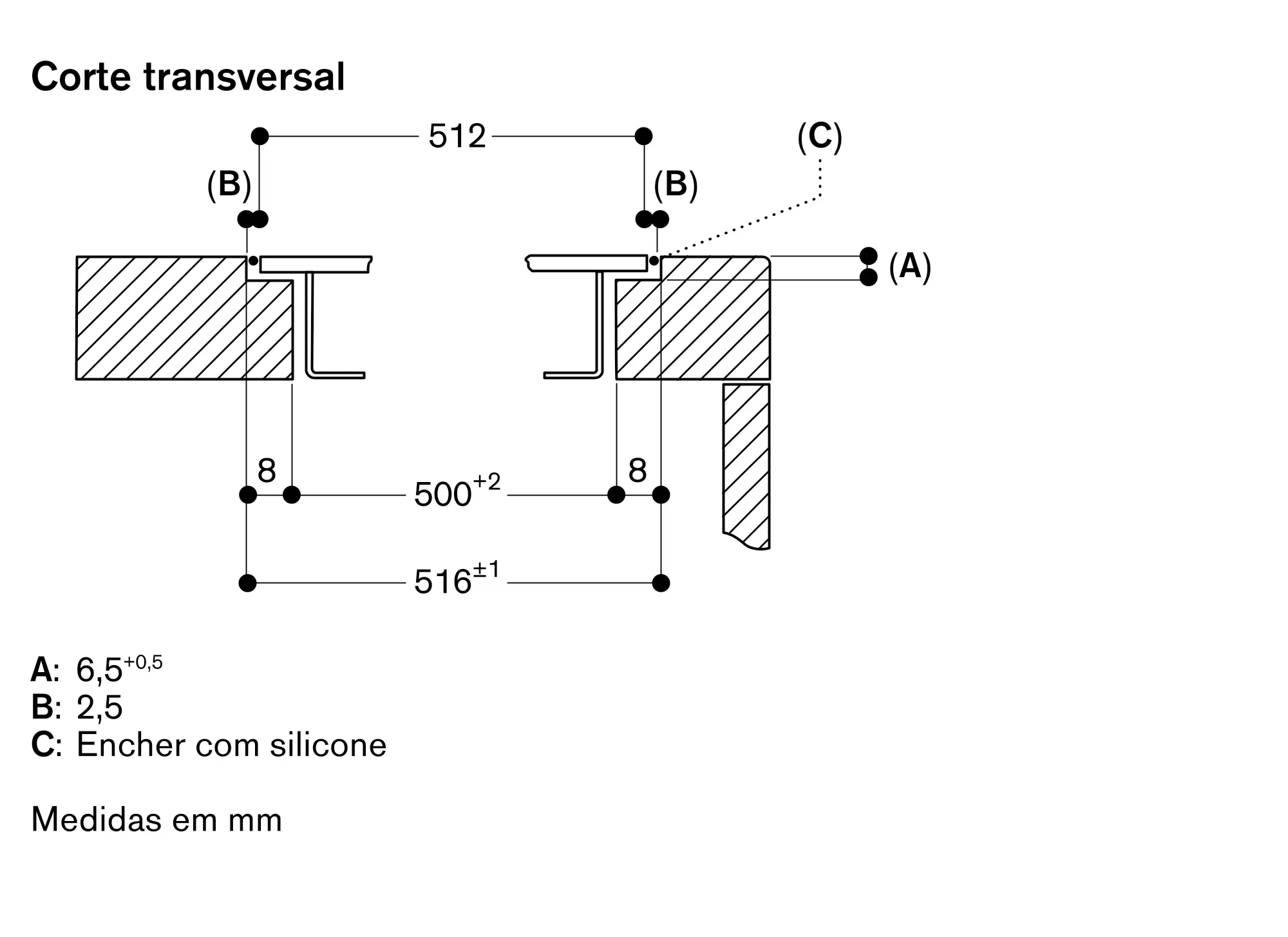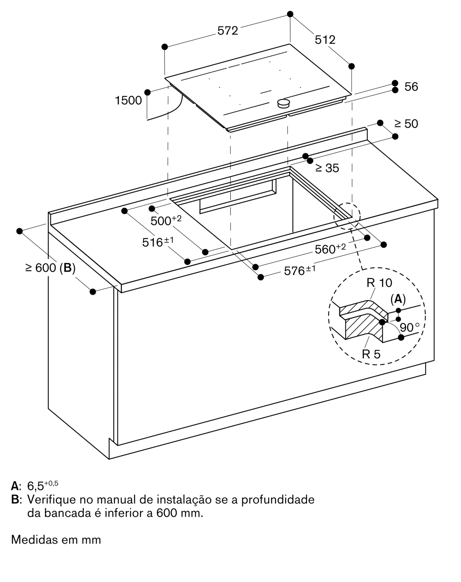 A instalação pode ser realizada em bancadas de pedra, materiais sintéticos ou madeira maciça. É importante garantir que as bordas cortadas são resistentes ao calor e que se encontram devidamente seladas para evitar a entrada de água. Para informações sobre outros materiais, recomenda-se consultar o fabricante da bancada.