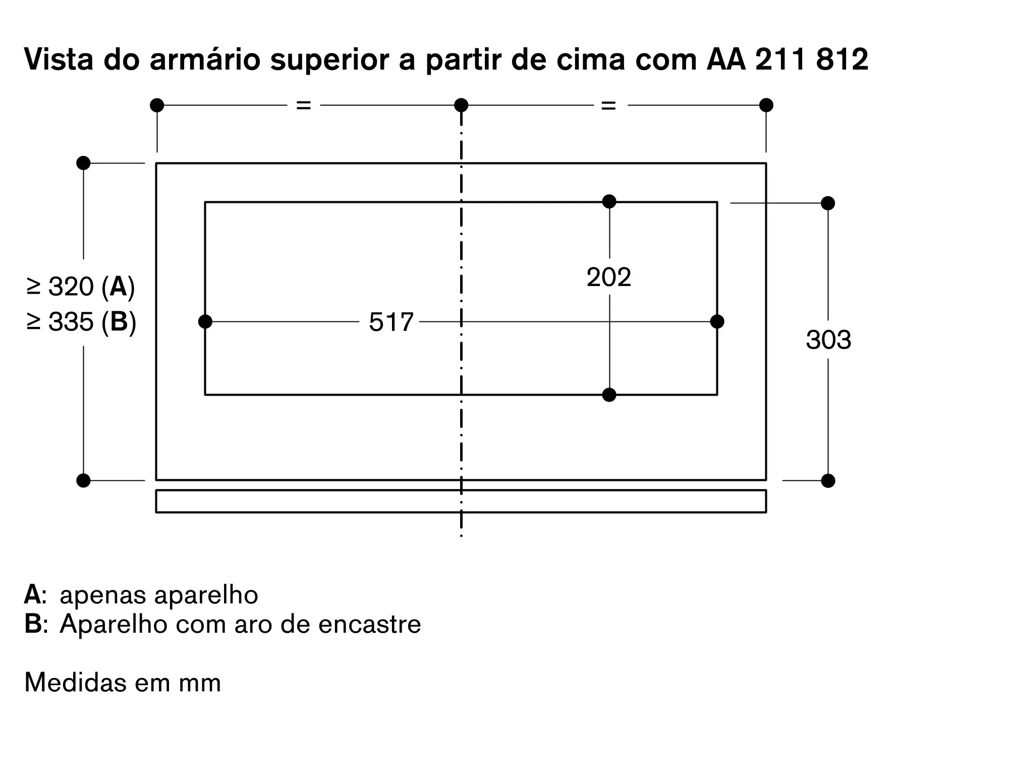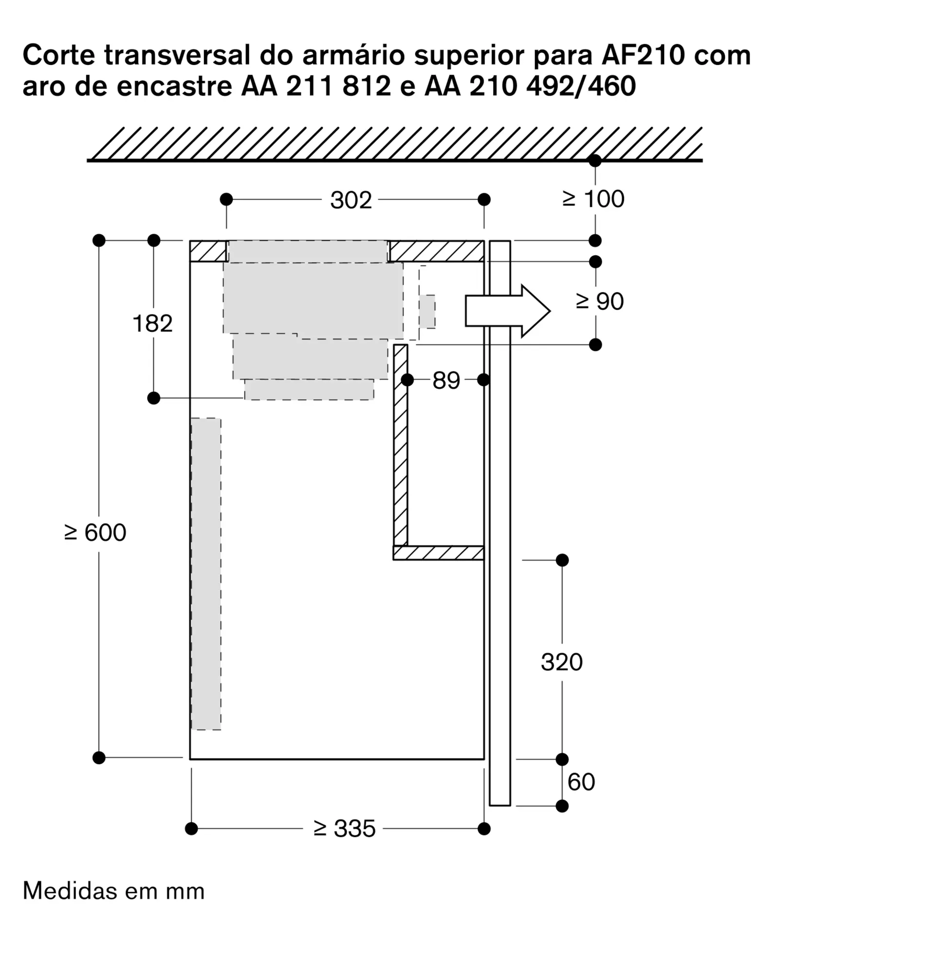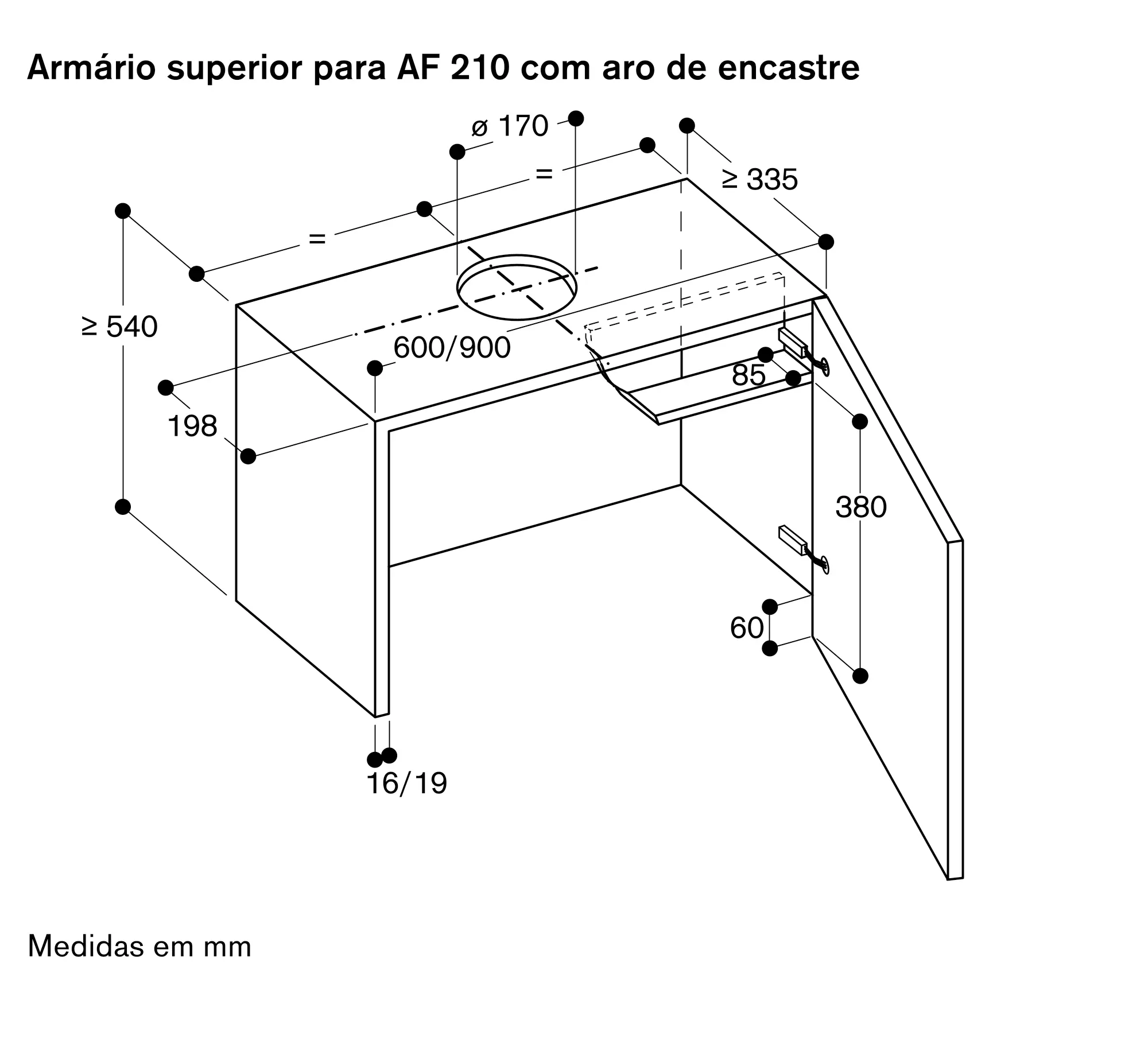 A altura necessária da cavidade do armário superior, juntamente com as medidas do acessório, aro de encastre 600 mm .