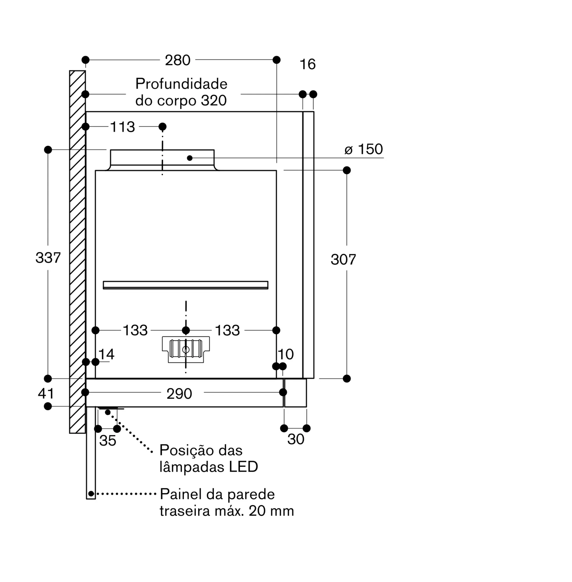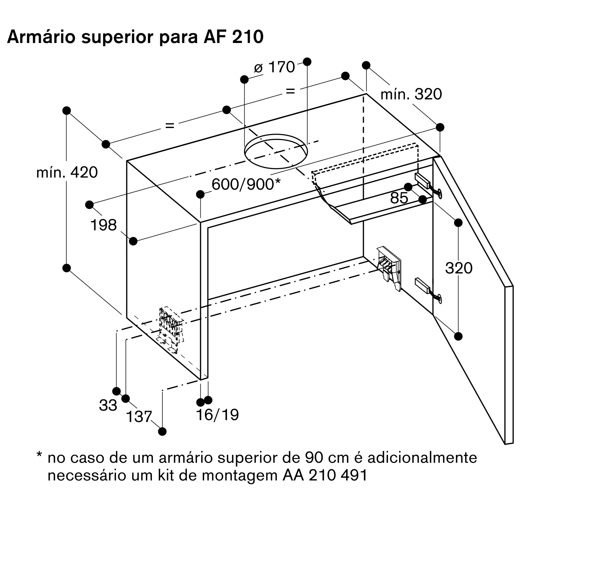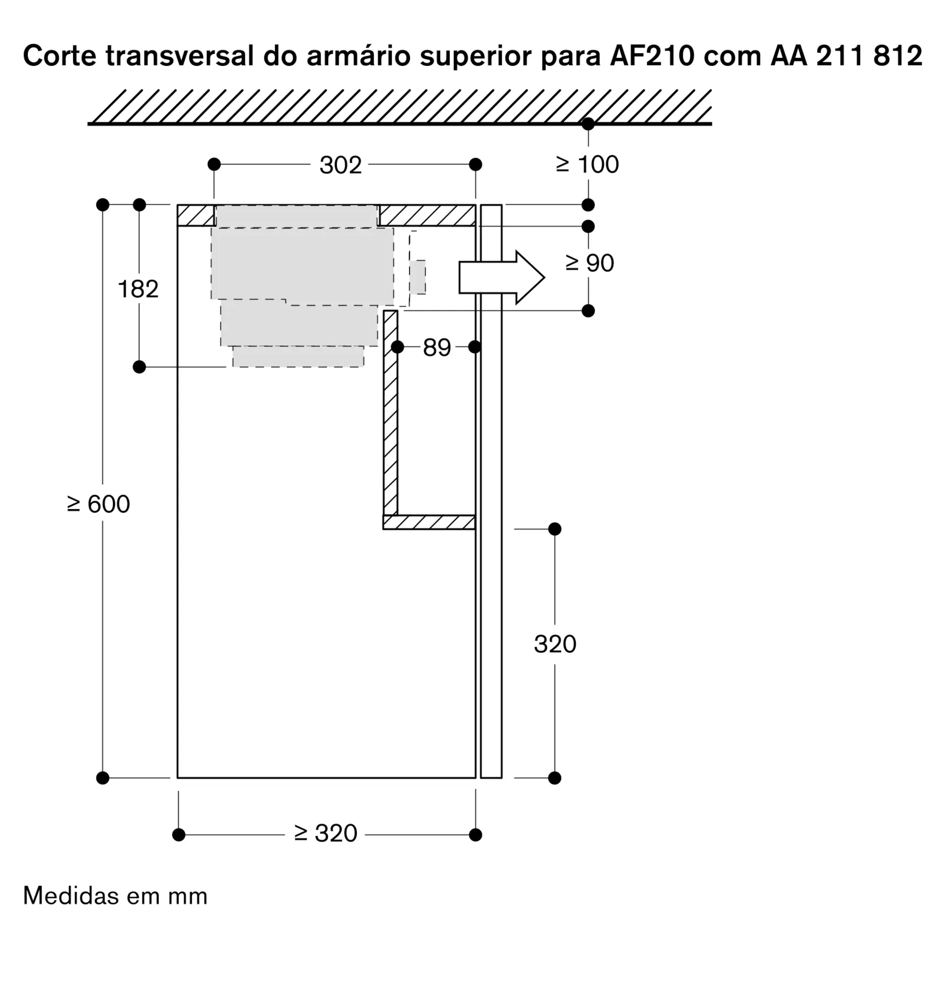 A altura necessária da cavidade do armário superior, juntamente com as medidas do acessório, aro de encastre 600 mm .
