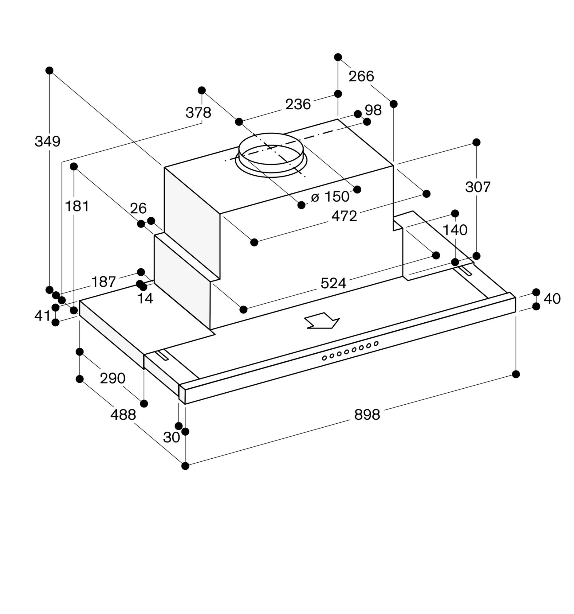 Módulo de recirculação com filtro de carvão activo, panteteado. Pode-se instalar num móvel superior, o filtro pode ser trocado facilmente pela frente.