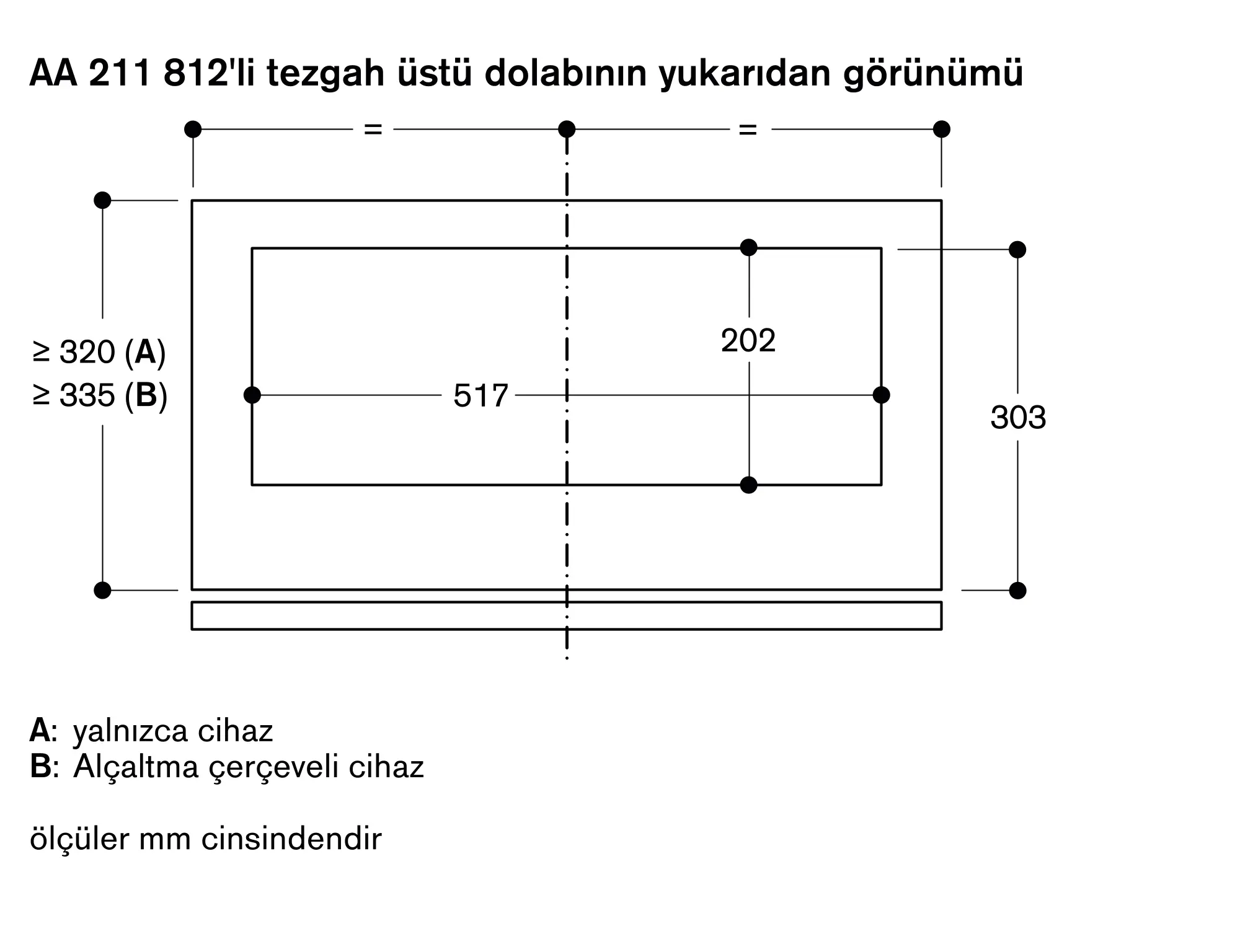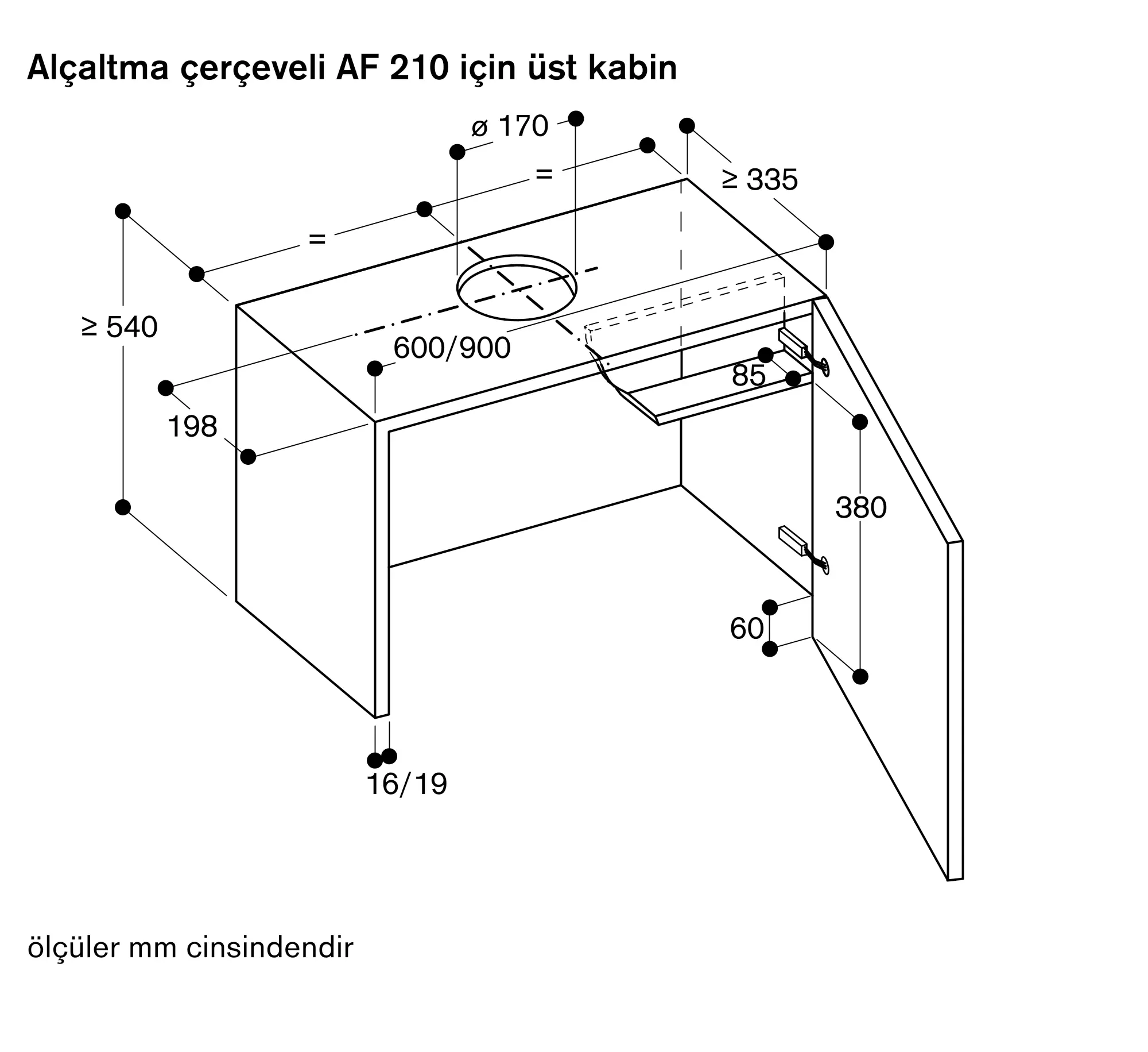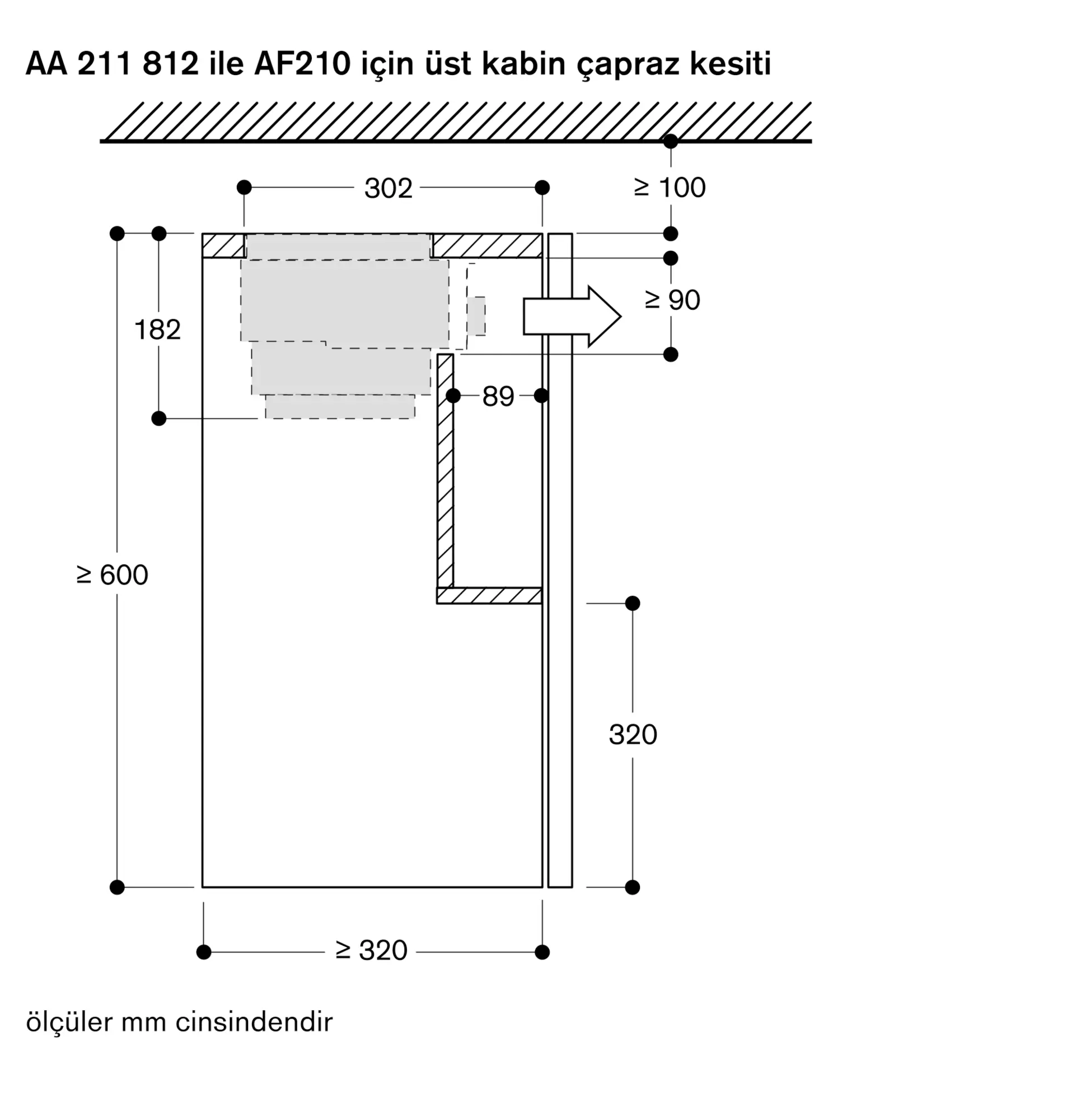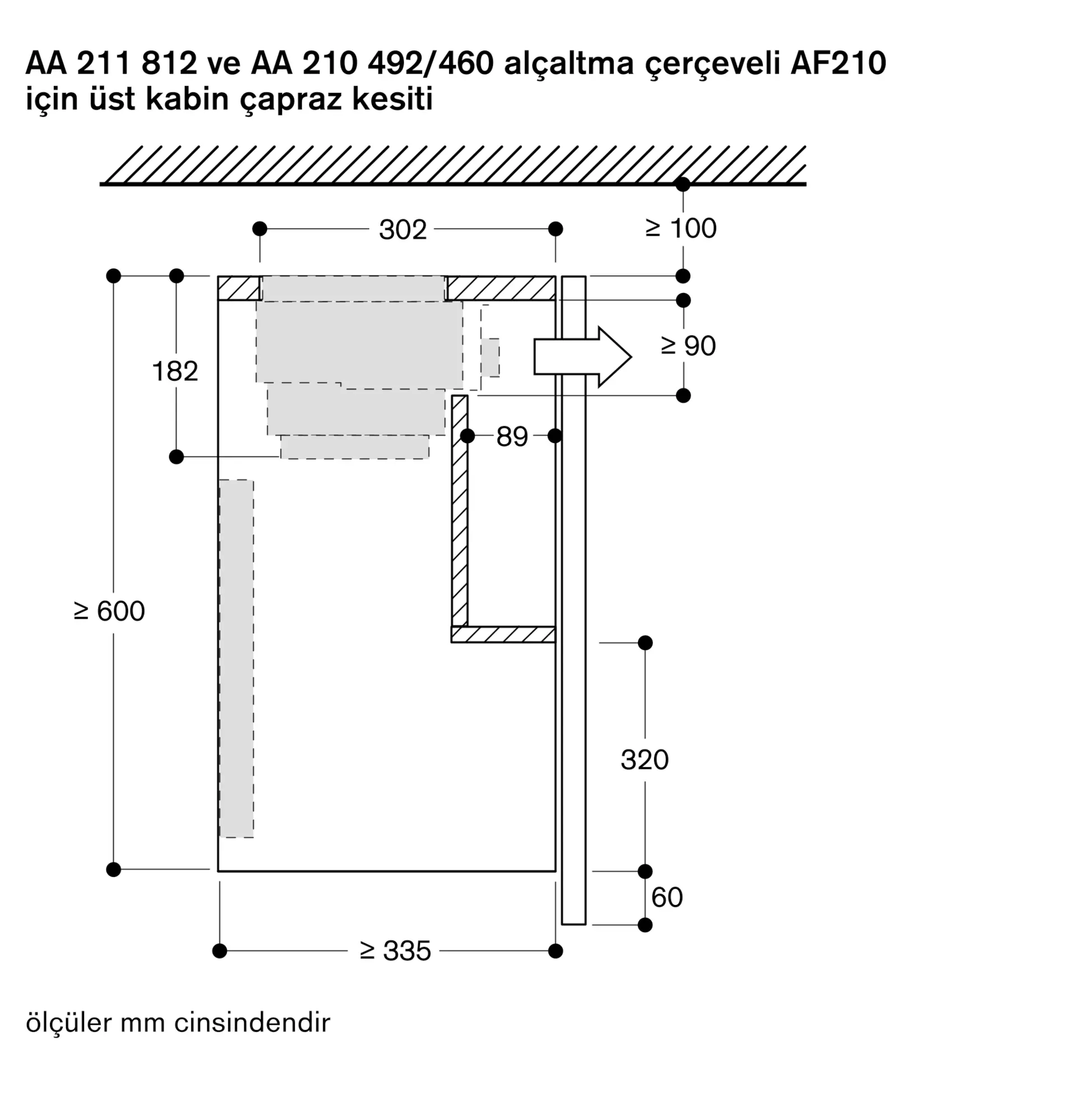 Aspiratör asansör mekanizması ile birlikte kullanılacaksa üst dolabın minimum derinliği 335 mm olmalıdır.