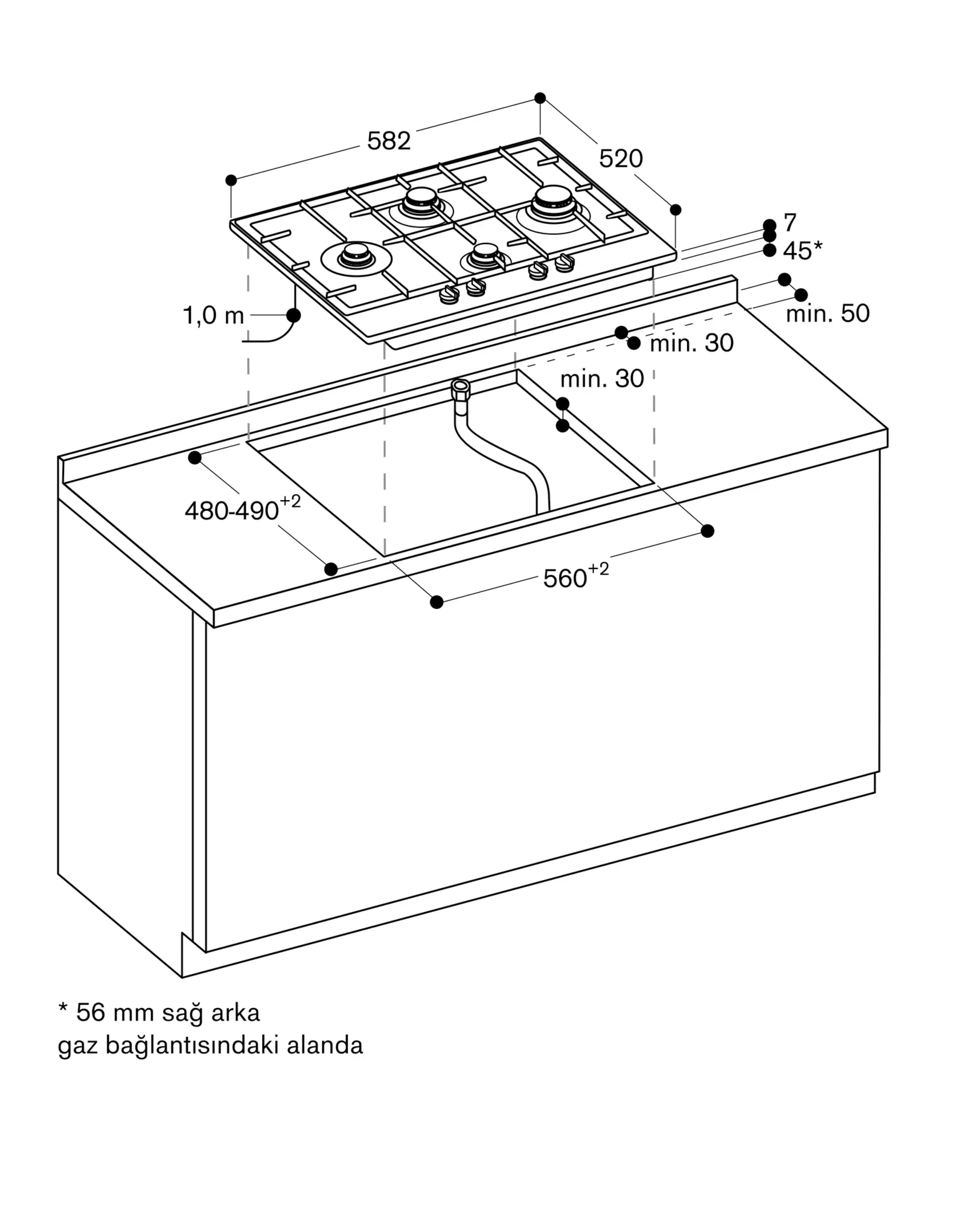 Gaz bağlantısı için çekmece derinliği planlanmalıdır.