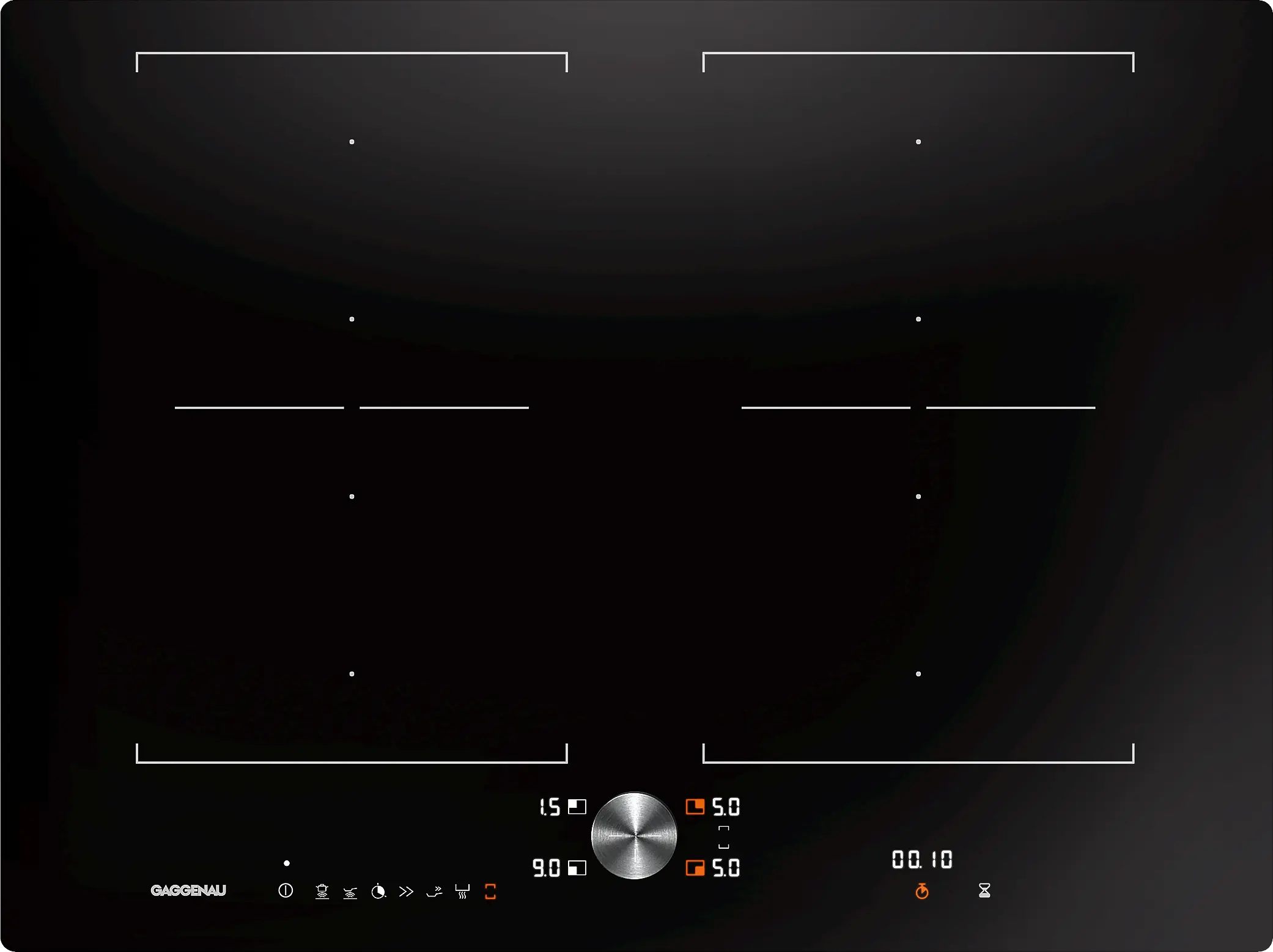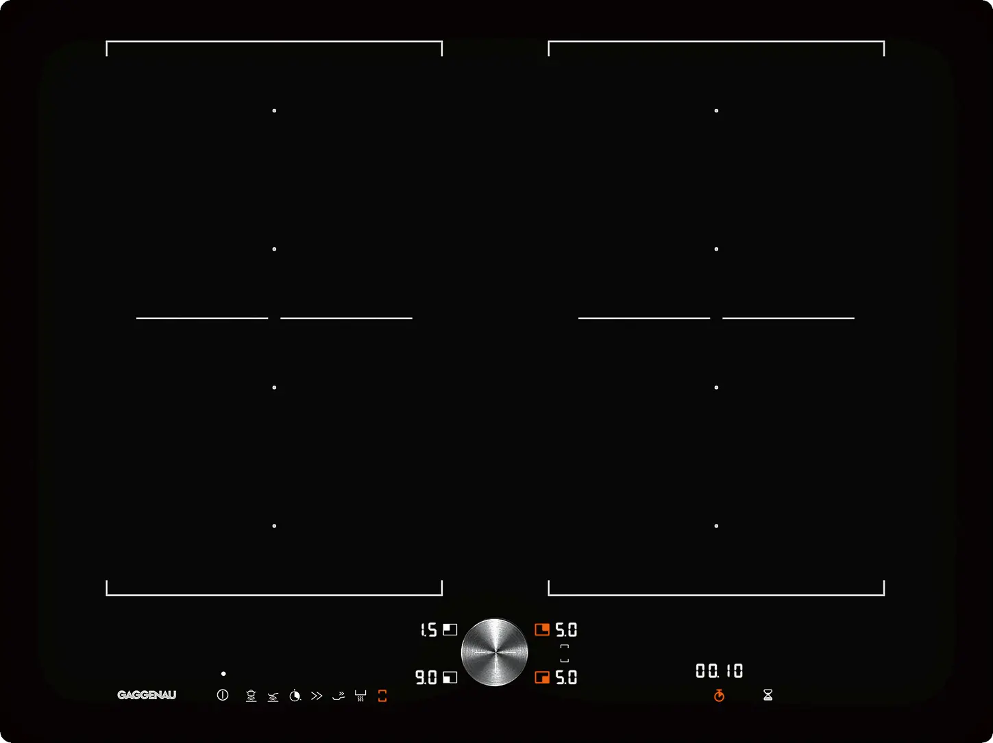 2 fleks indüksiyon pişirme alanı 19x23 cm (2200 W, booster ile 3700 W), birleştirildiğinde 38x23 cm (3300 W, booster ile 3700 W).