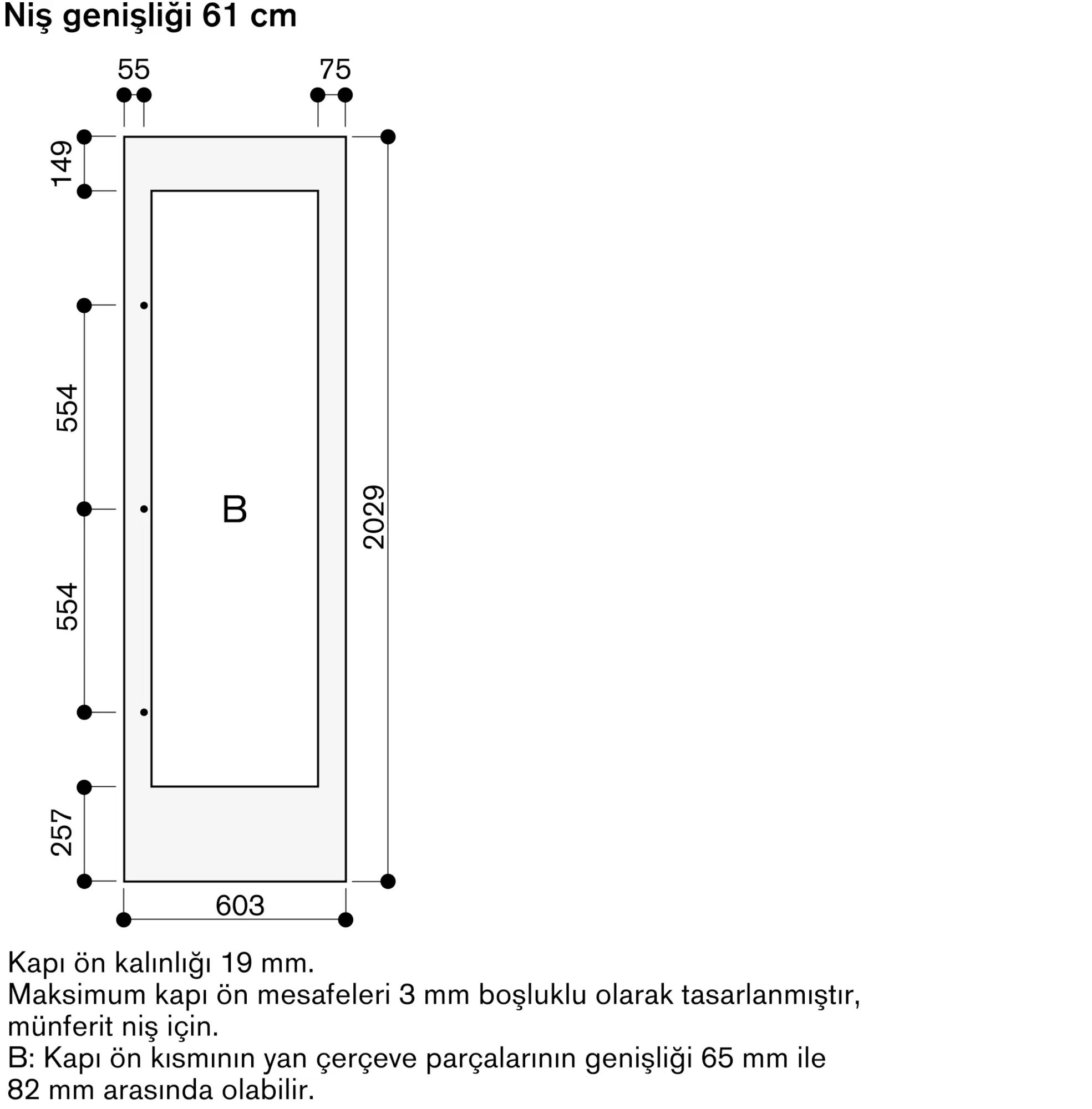 61 cm genişlikteki cihazlar için, sağ menteşeli, panel kalınlığı 19 mm.
