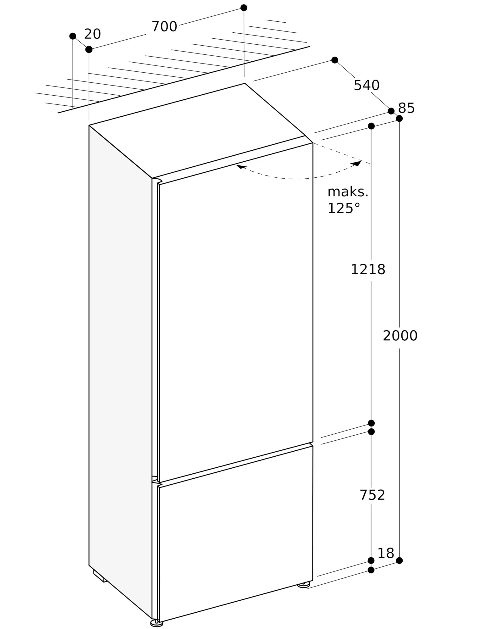 Kapı açılım açısı 125°, 90°'de sabitlenebilir.