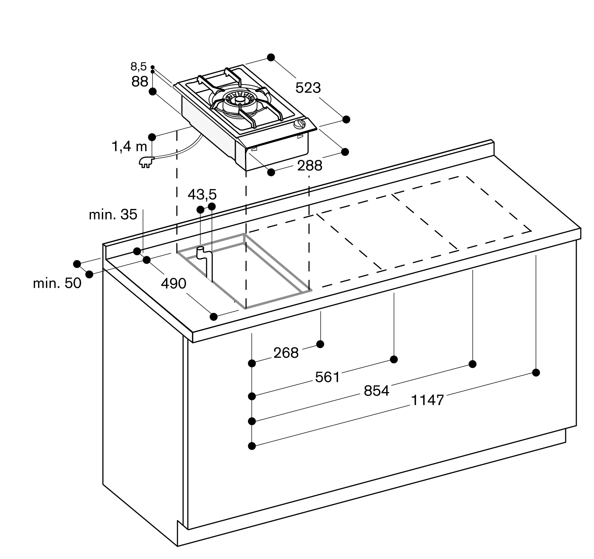Cihaz çalışma tezgahına üstten monte edilebilir.