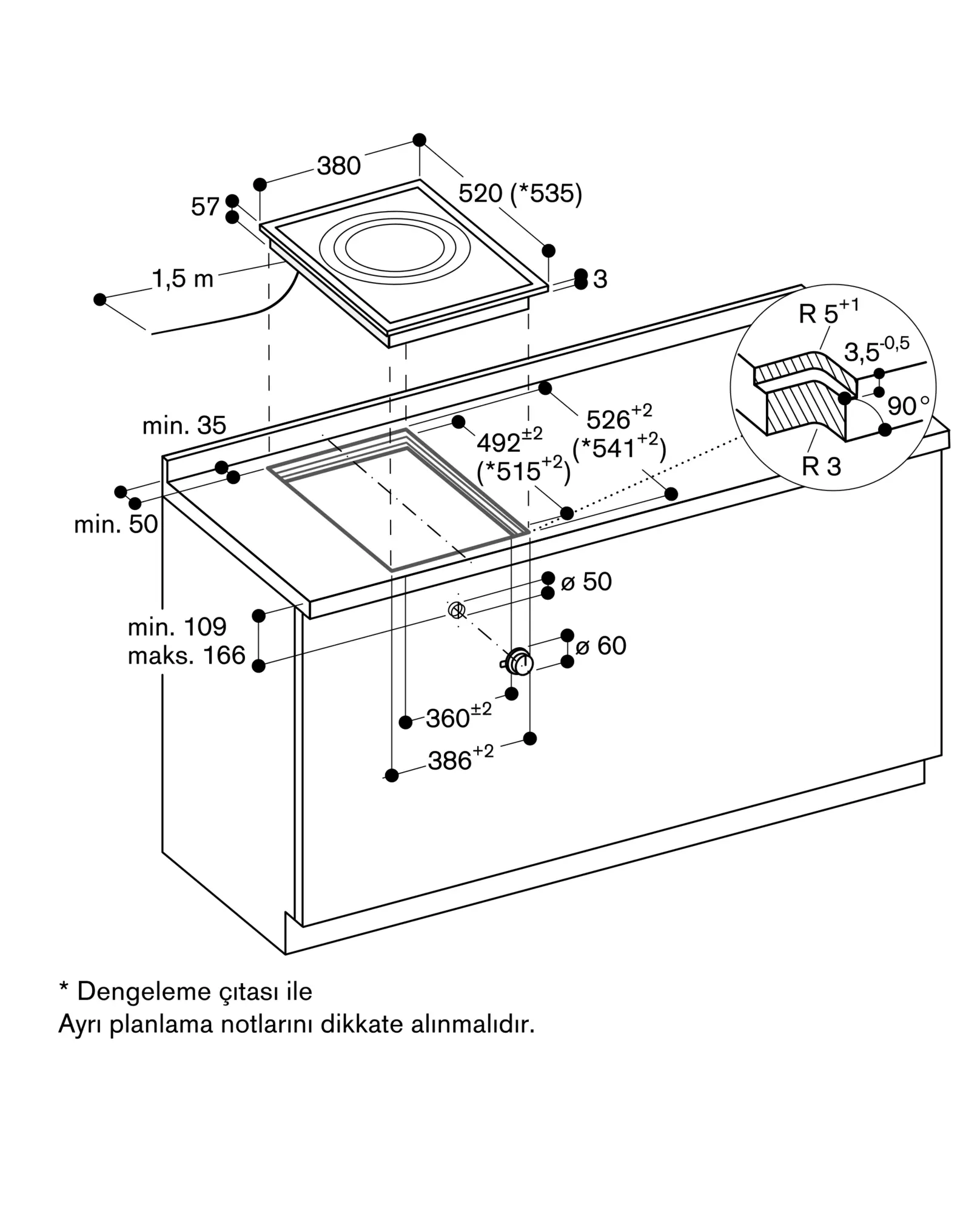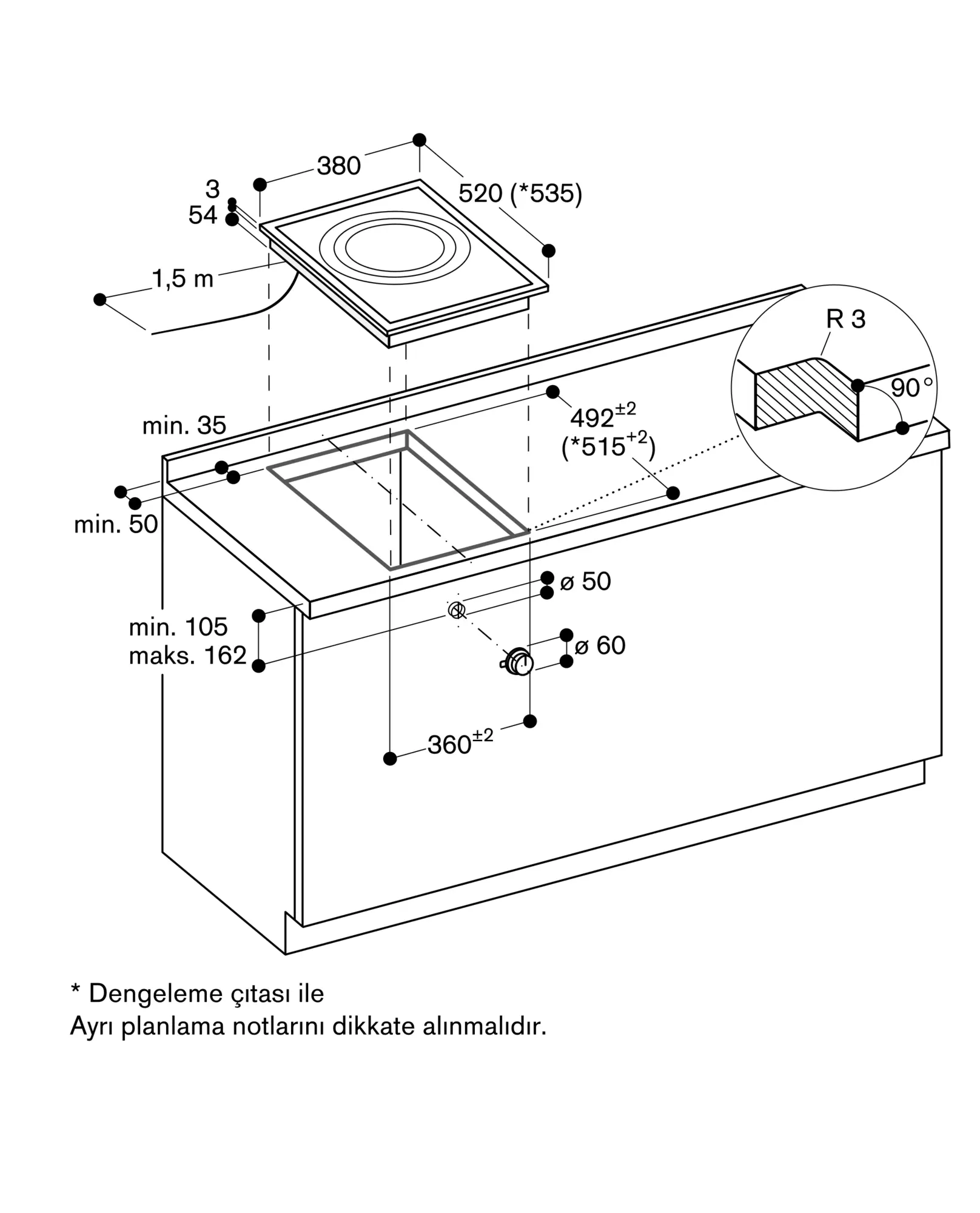 Taş, sentetik veya masif ahşap tezgahlar hemyüzey montaja uygundur. Kesim kenarlarının ısı direnci ve sıvı sızdırmazlığı sağlanmalıdır. Diğer tezgah malzemeleri ile ilgili olarak lütfen tezgah üreticisine danışınız.
