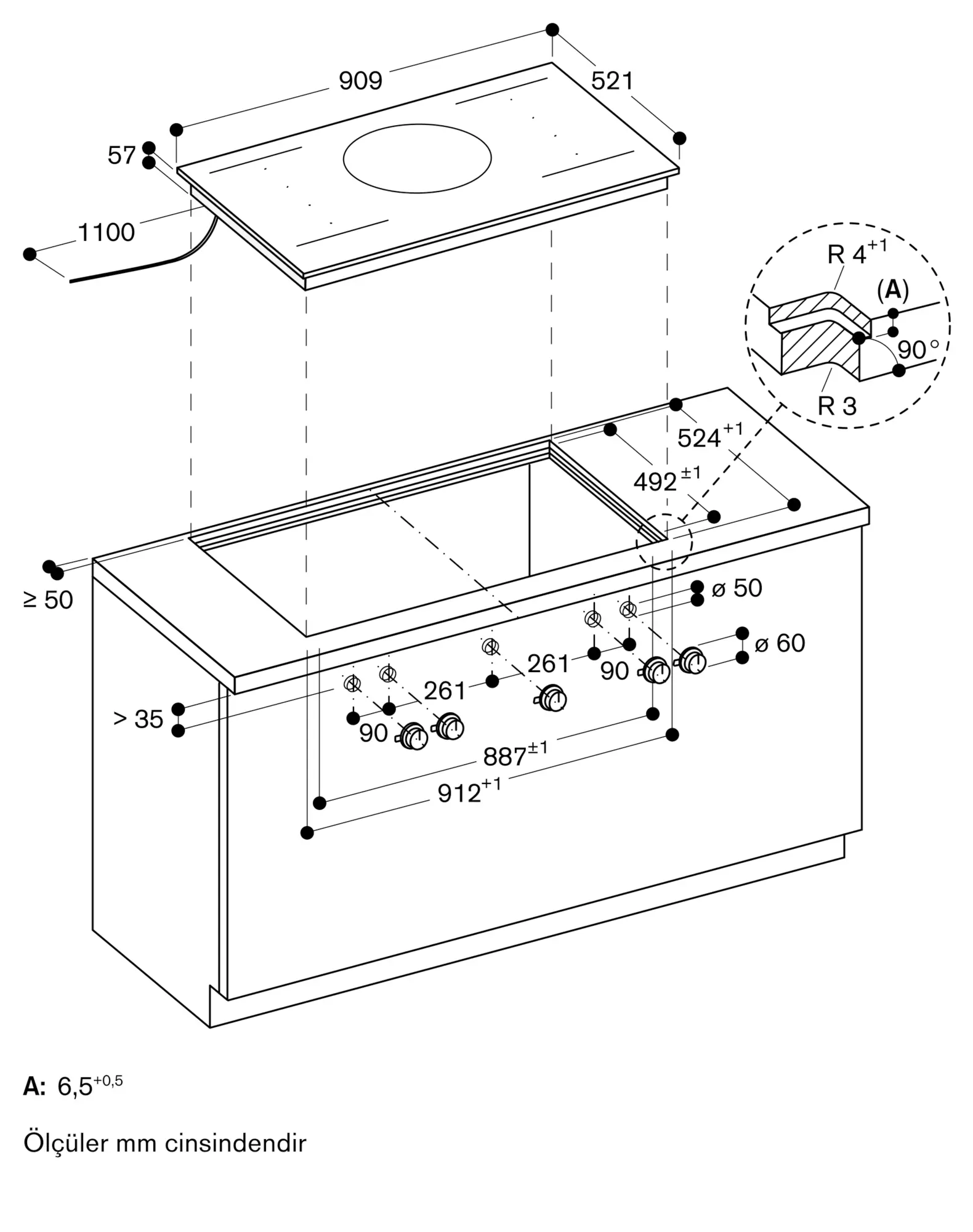 Taş, sentetik veya masif ahşap tezgahlar hemyüzey montaja uygundur. Kesim kenarlarının ısı direnci ve sıvı sızdırmazlığı sağlanmalıdır. Diğer tezgah malzemeleri ile ilgili olarak lütfen tezgah üreticisine danışınız.