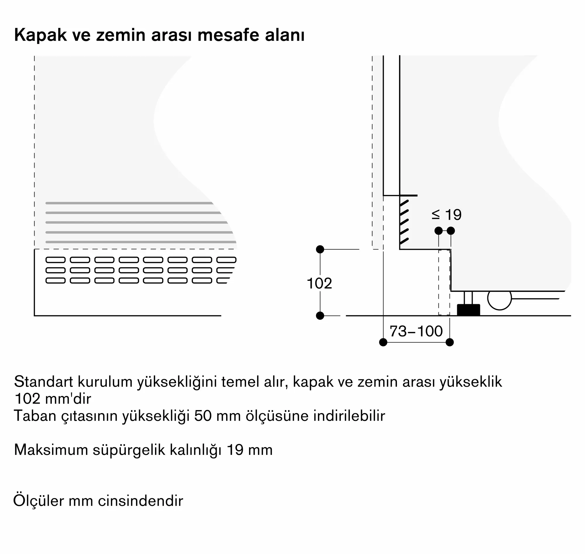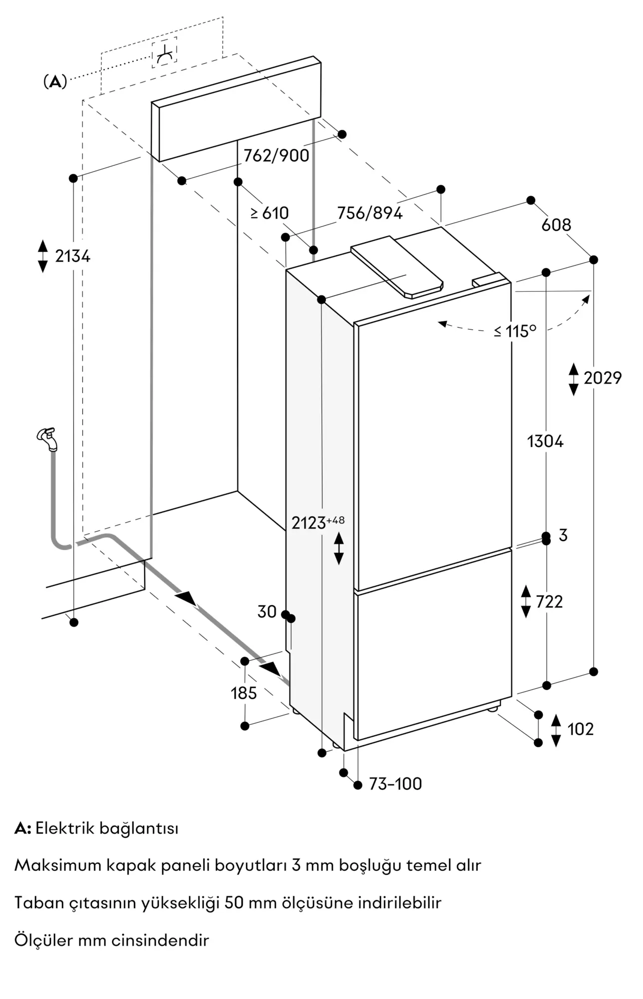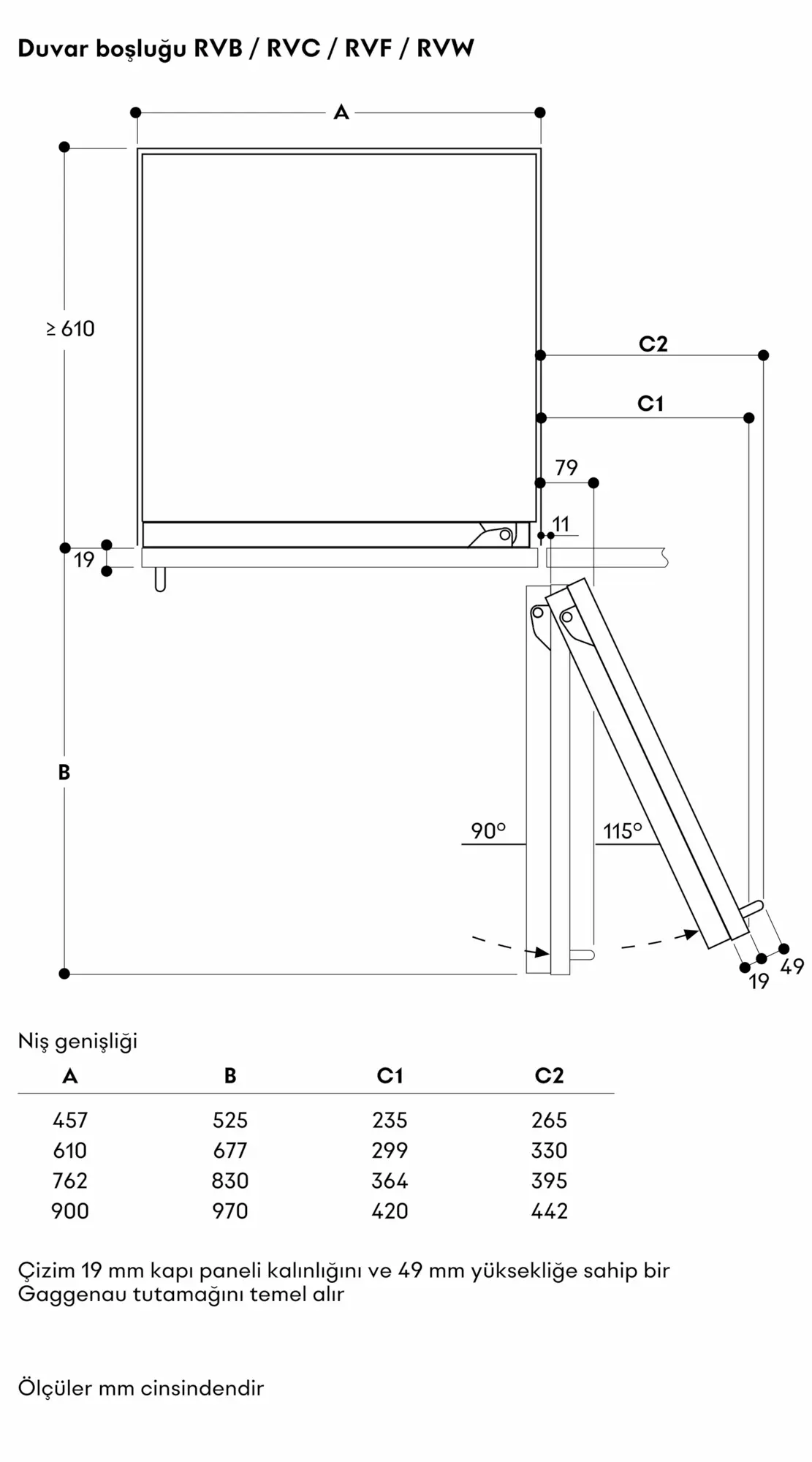 Kapı açılma açısı 115°, 90° olarak montaj yapılabilir.