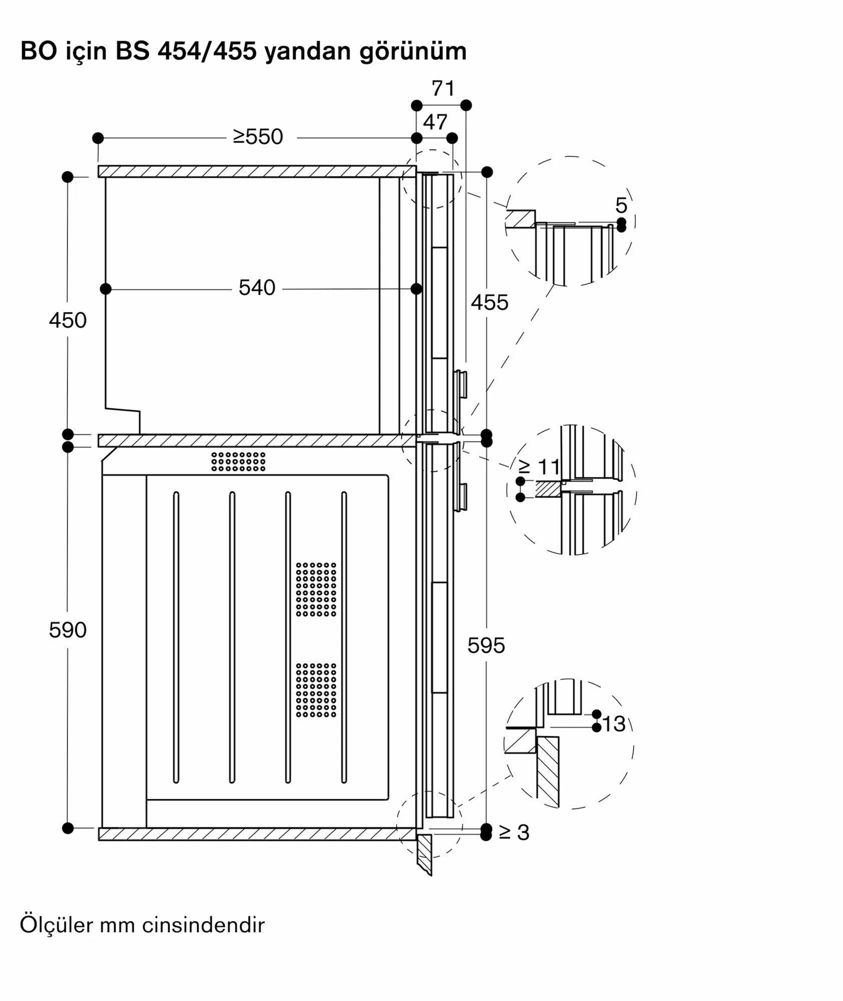 Cihaz paneli, mobilya yüzeyinden 47 mm dışarı çıkar.