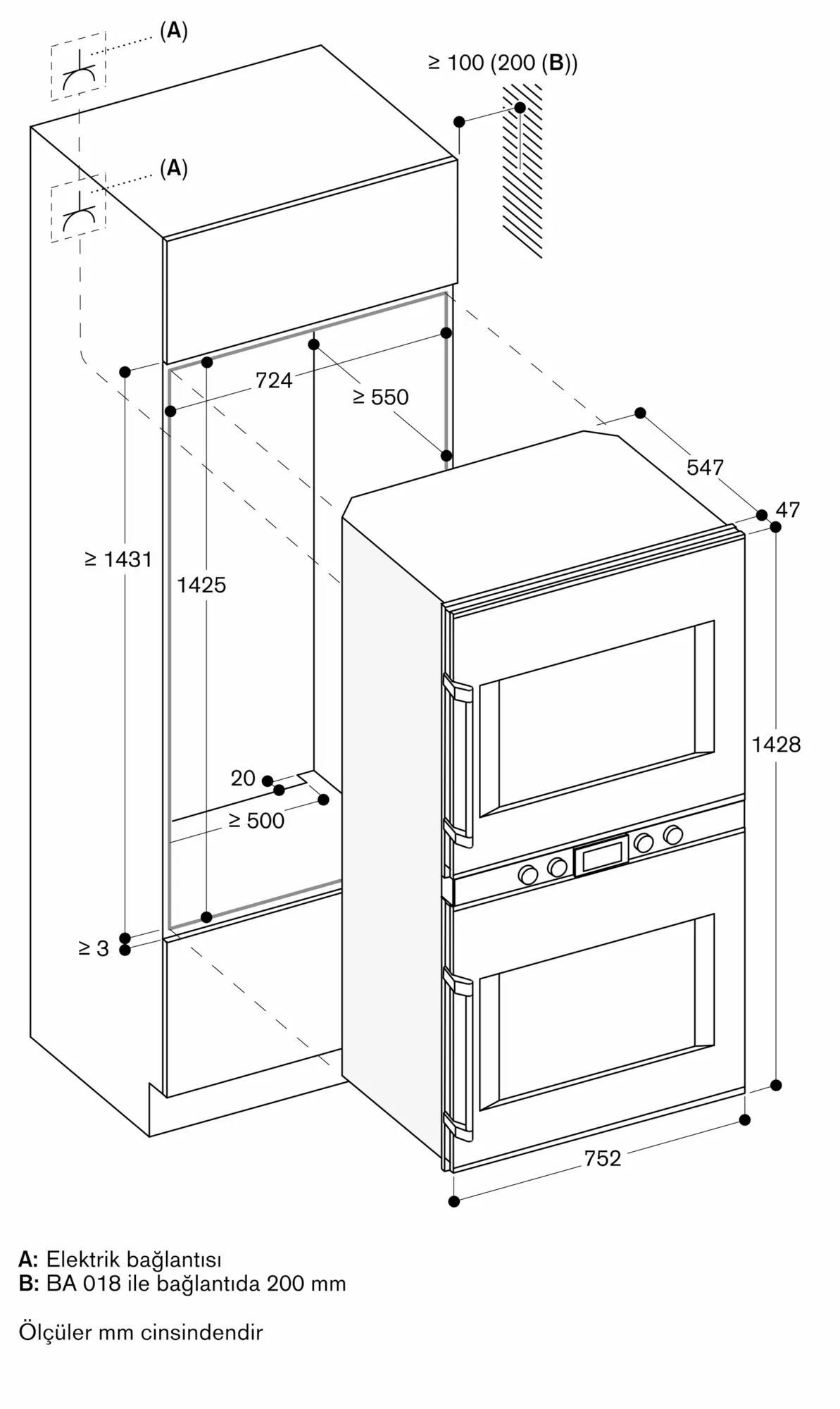 Cihaz paneli, mobilya yüzeyinden 47 mm dışarı çıkar.