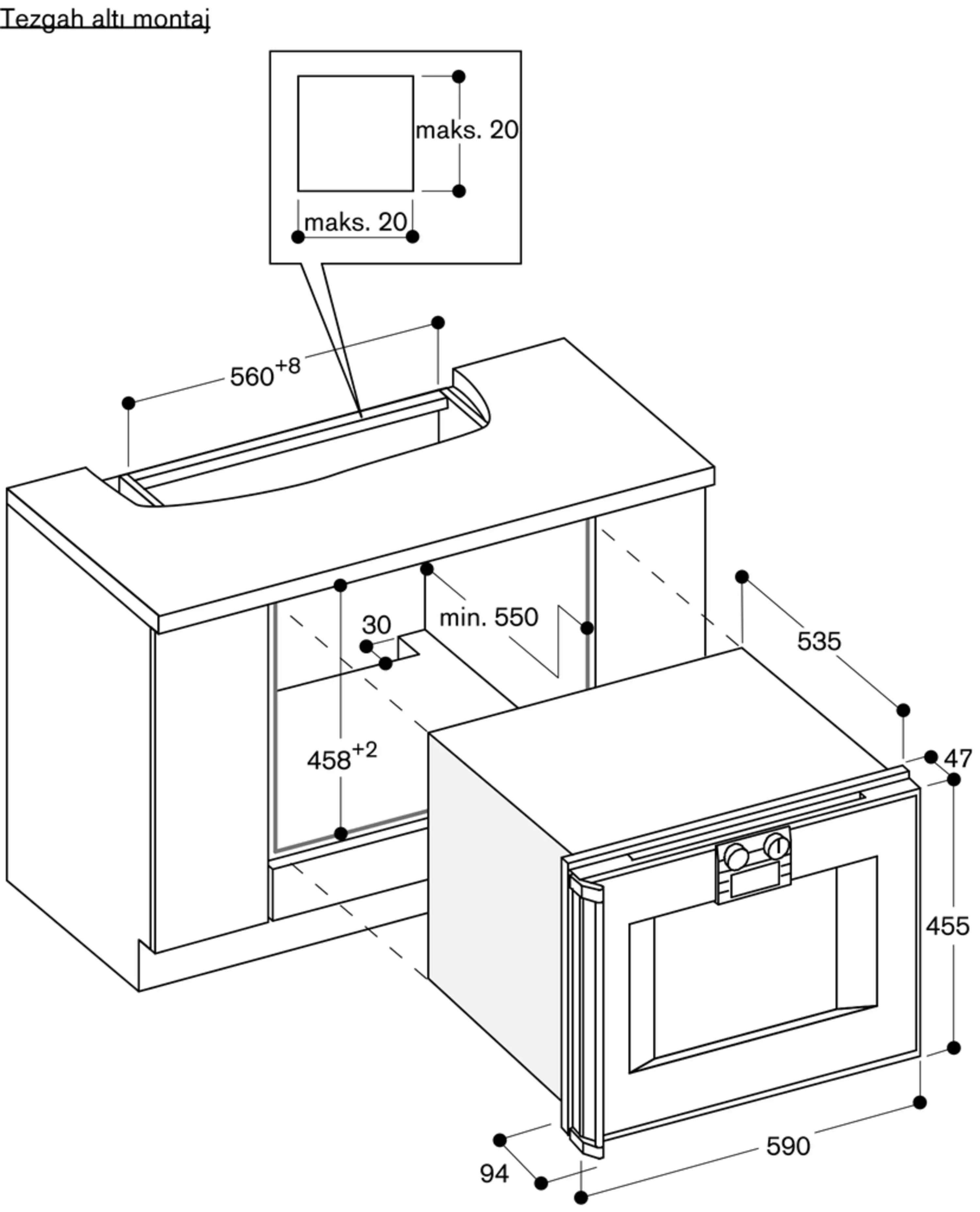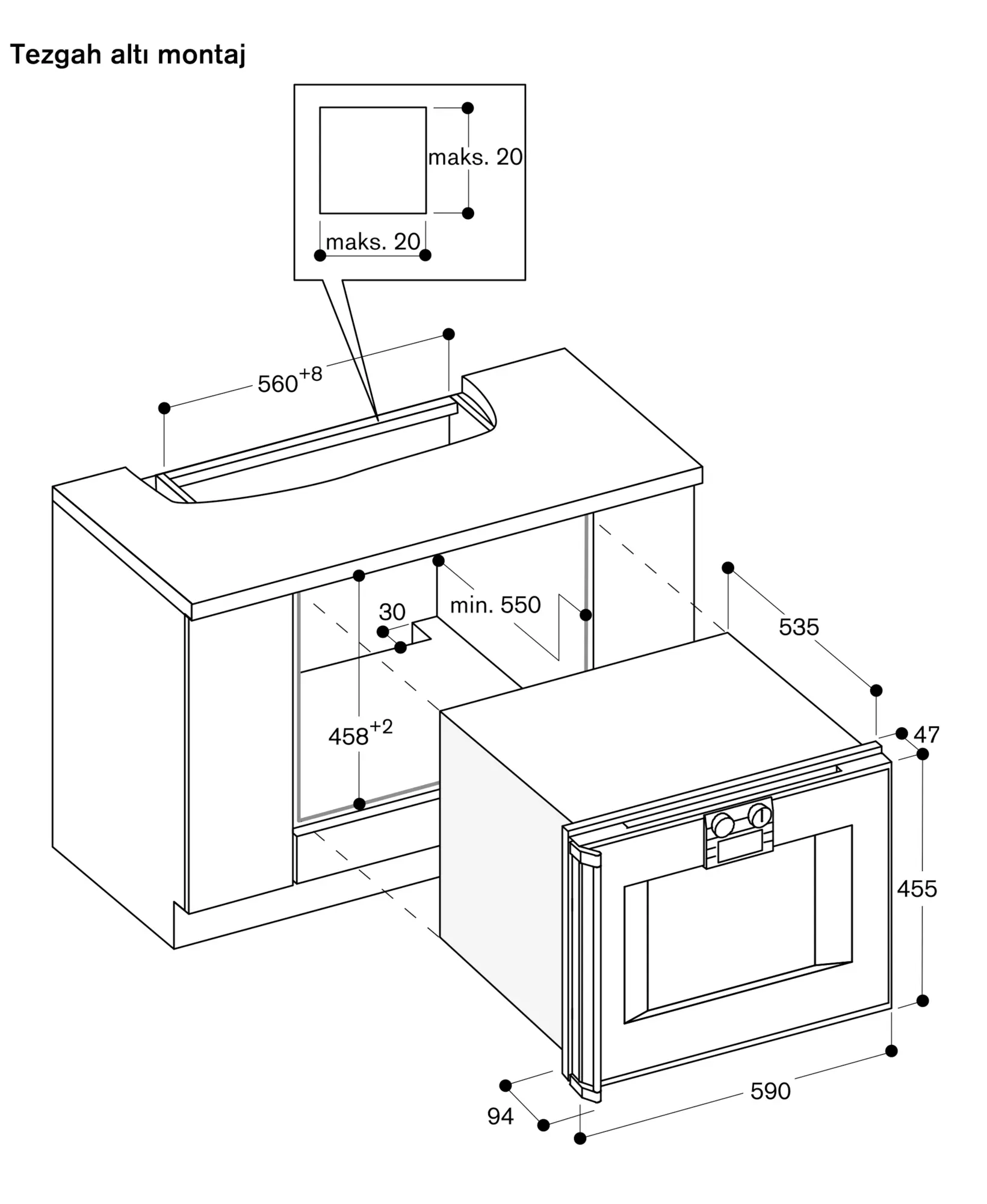 Cihaz paneli, mobilya yüzeyinden 47 mm dışarı çıkar.