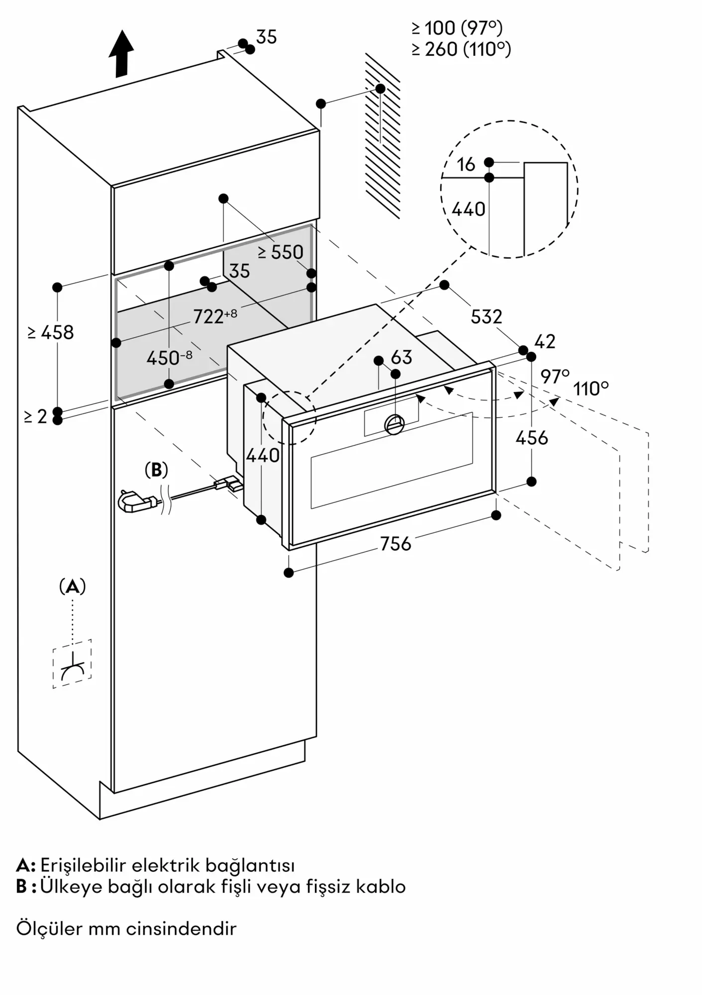 Şebeke prizi erişilebilir olmalı ve yerleşik nişin dışında bulunmalıdır.