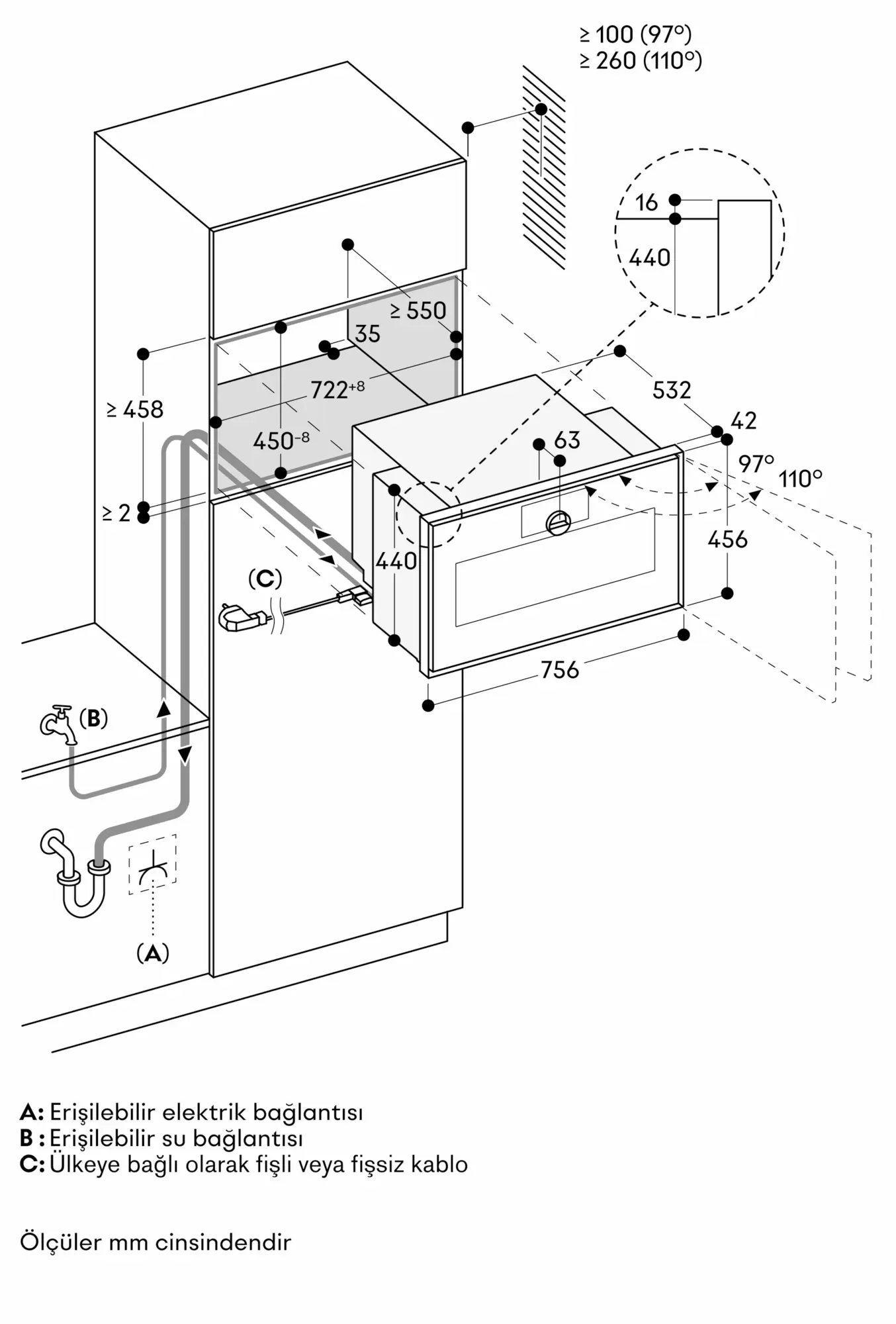 Şebeke prizi erişilebilir olmalı ve yerleşik nişin dışında bulunmalıdır.